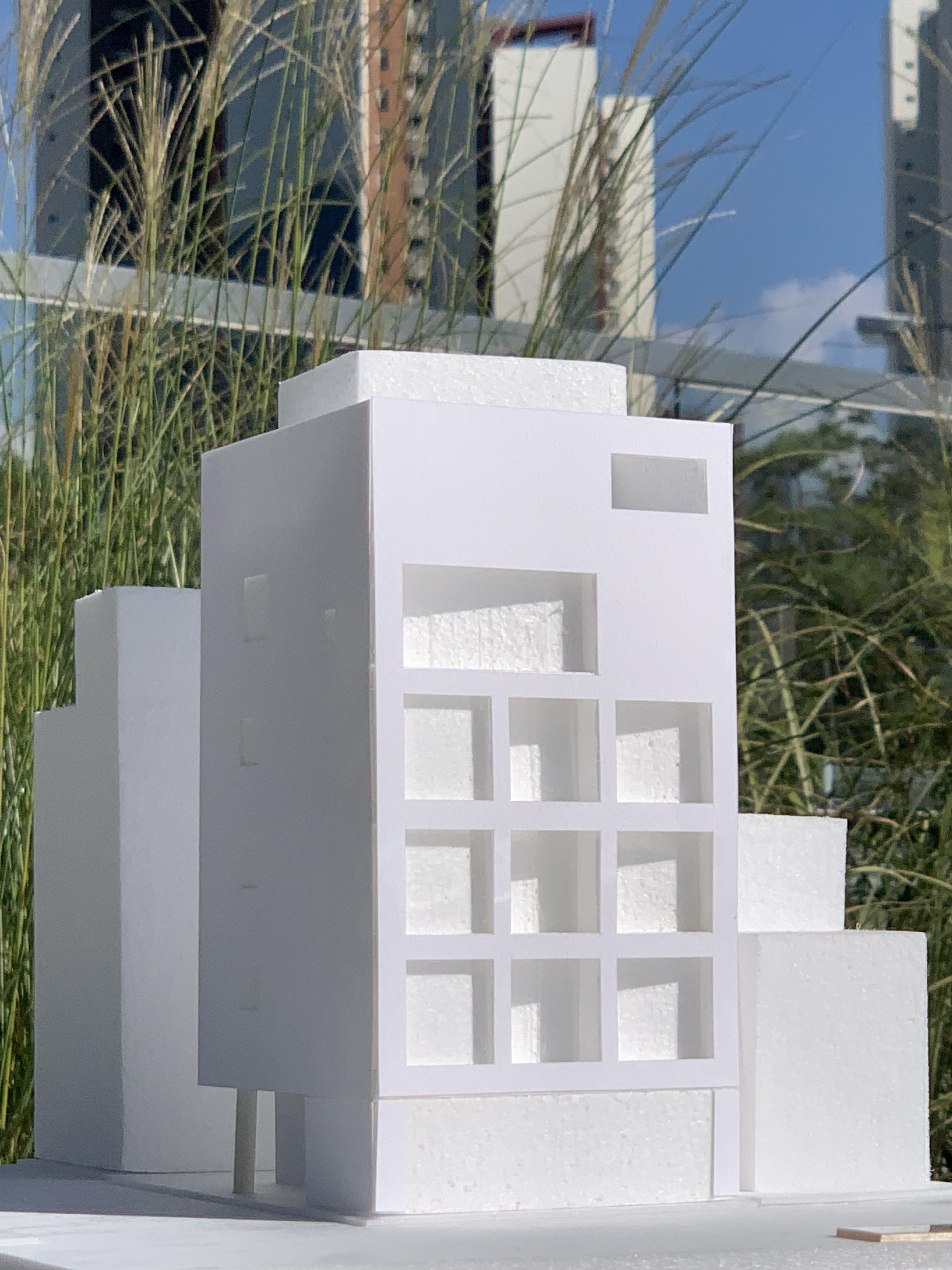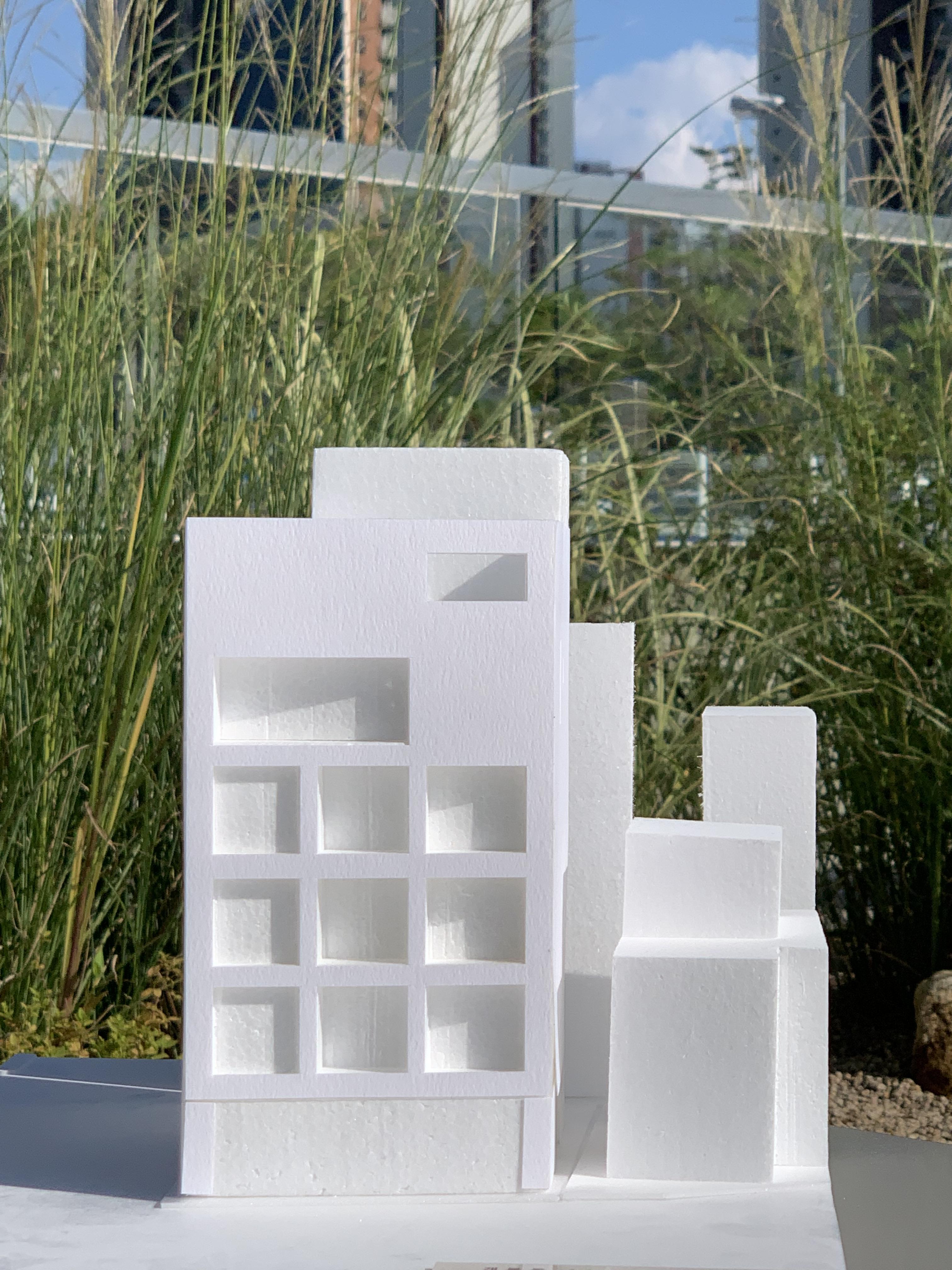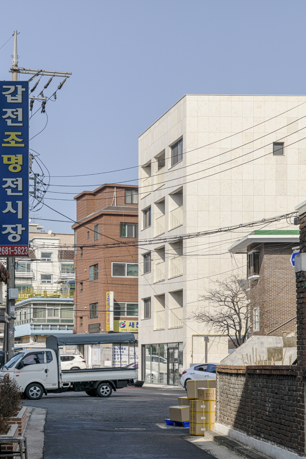 사진에서 보이는 입면은 착시에 가깝다. 발코니의 안쪽이 사선이 아니라 발코니 안쪽 창호가 직각이고 난간이 있는 외피가 대지의 형태에 따라 사선이다. 모델링 이미지에서는 정면의 사선과 사다리꼴 형태의 평면이 조금 더 잘 인식된다. 아이코닉한 박스와 입면의 비례로만 승부하려 했는데 현실은 가성비를 추구한 원룸 다가구에 가깝다.