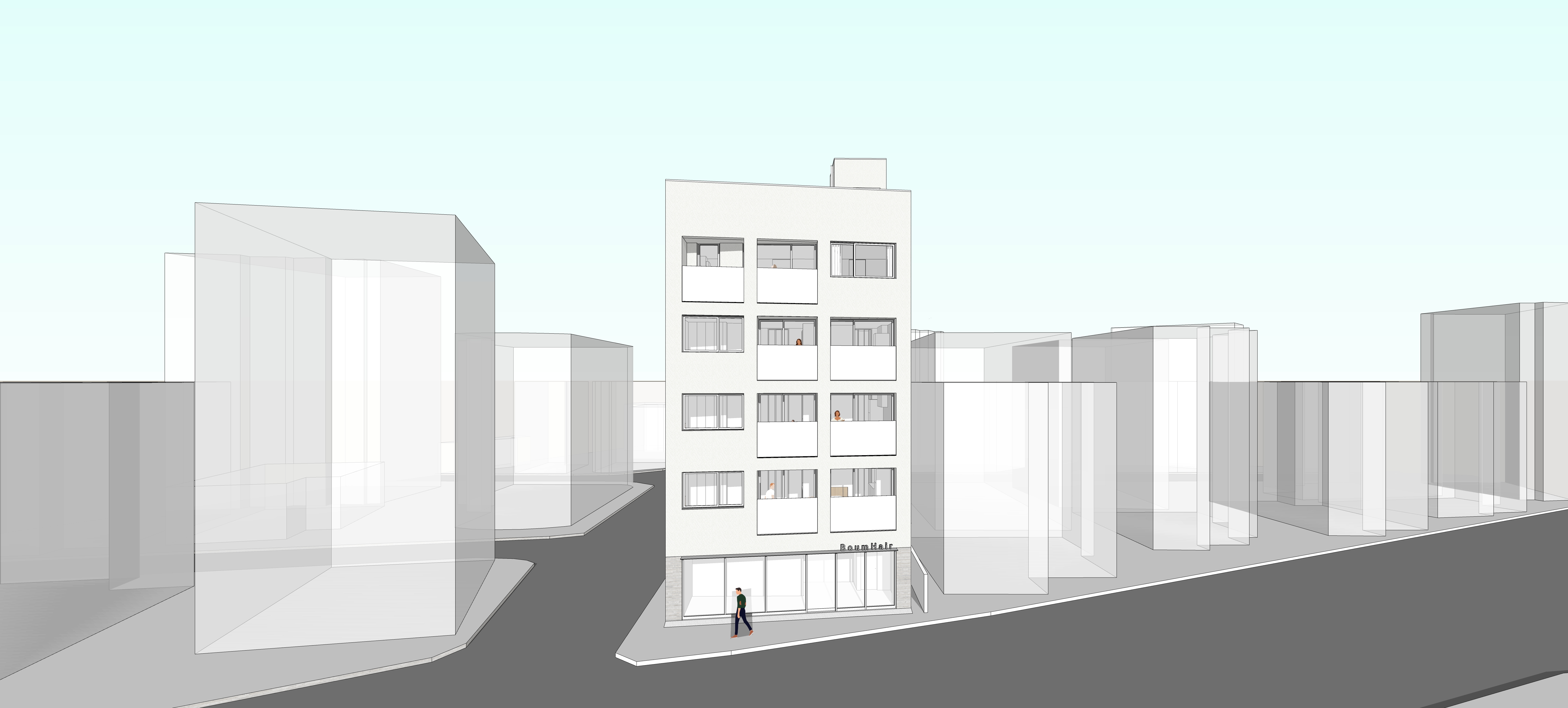 사진에서 보이는 입면은 착시에 가깝다. 발코니의 안쪽이 사선이 아니라 발코니 안쪽 창호가 직각이고 난간이 있는 외피가 대지의 형태에 따라 사선이다. 모델링 이미지에서는 정면의 사선과 사다리꼴 형태의 평면이 조금 더 잘 인식된다. 아이코닉한 박스와 입면의 비례로만 승부하려 했는데 현실은 가성비를 추구한 원룸 다가구에 가깝다.