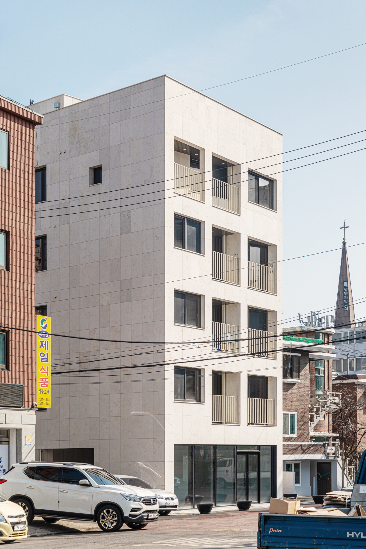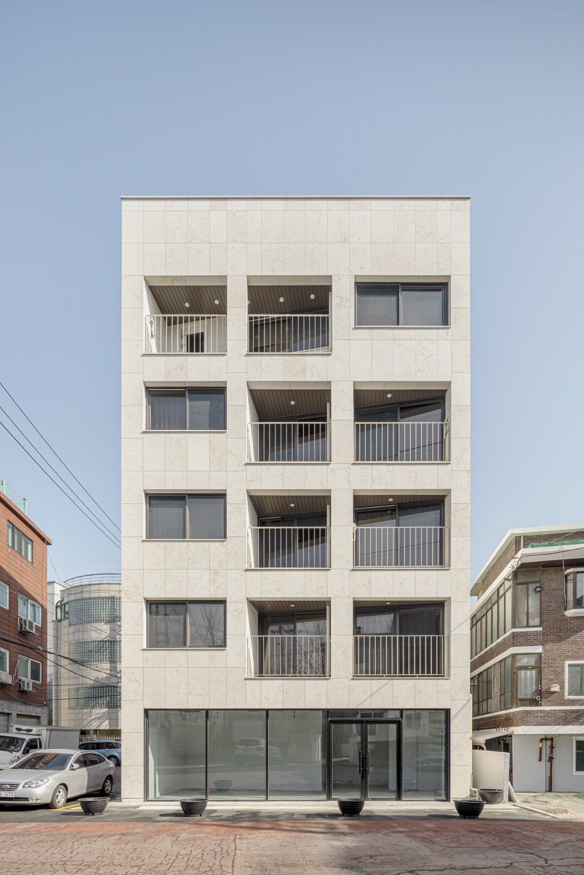외단열시스템 (구조벽체 바깥에 단열재를 붙이고 단열재 위에 탄성이 있는 도장으로 마감하는 공법)의 외벽마감이 공사를 하면서 석재로 바뀌는 바람에 줄눈 나누기를 처음부터 의도할 수 없었던 점, 입면 표정의 5할을 담당할 난간의 형태가 바뀐 점이 큰 아쉬움으로 남지만, 각각의 프로젝트는 각자 나아가는 방향이 있다. 처음부터 어떤 방향으로 흘러가리라는 걸 아는 프로젝트도 있고 여정의 가운데에서 큰 변곡점을 갖는 프로젝트도 있다. 그렇게 흘러간다는 걸 받아들이고 그 상황에서 건축가가 할 수 있는 것을 한다. 그게 프로다, 마.