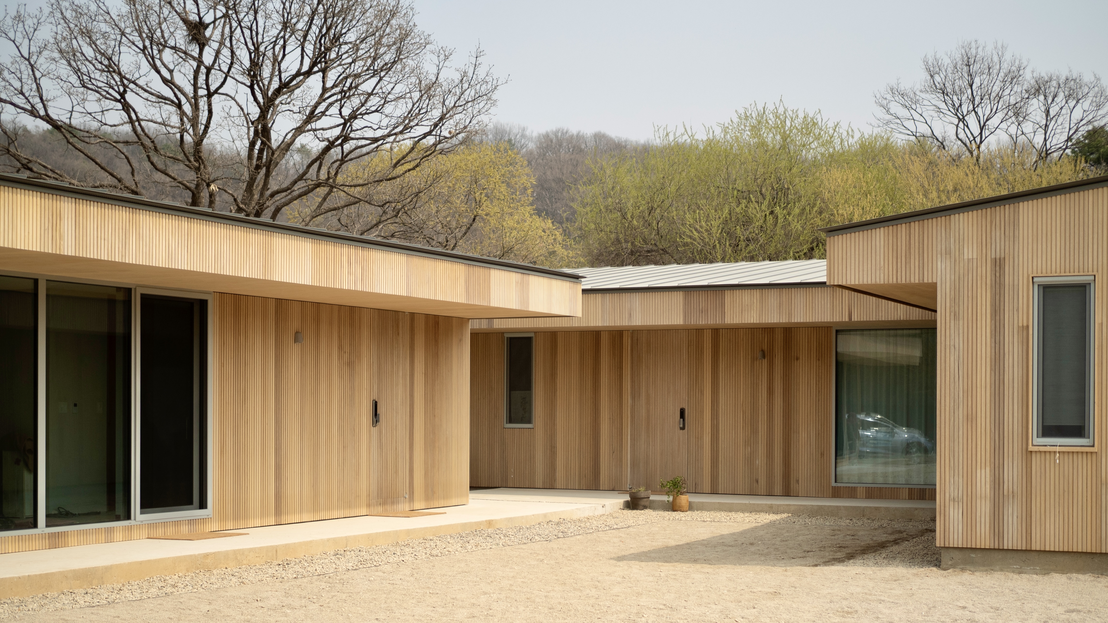 ㄱ자로 마당을 감싸는 살림채와 서재 겸 작은 소모임을 위한 공간이자 반려견들을 위한 별채가 있는 파주 장곡리의 주택.