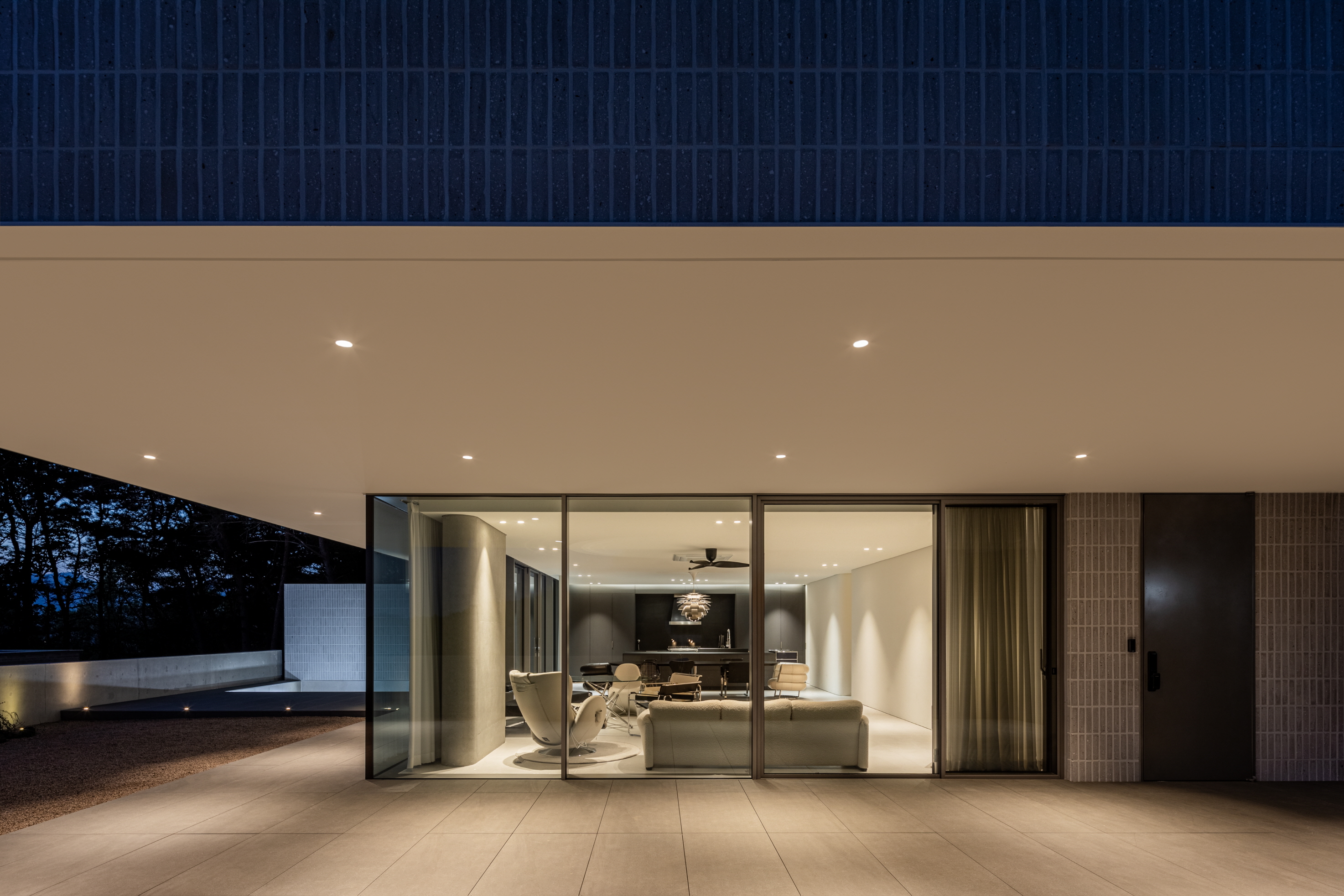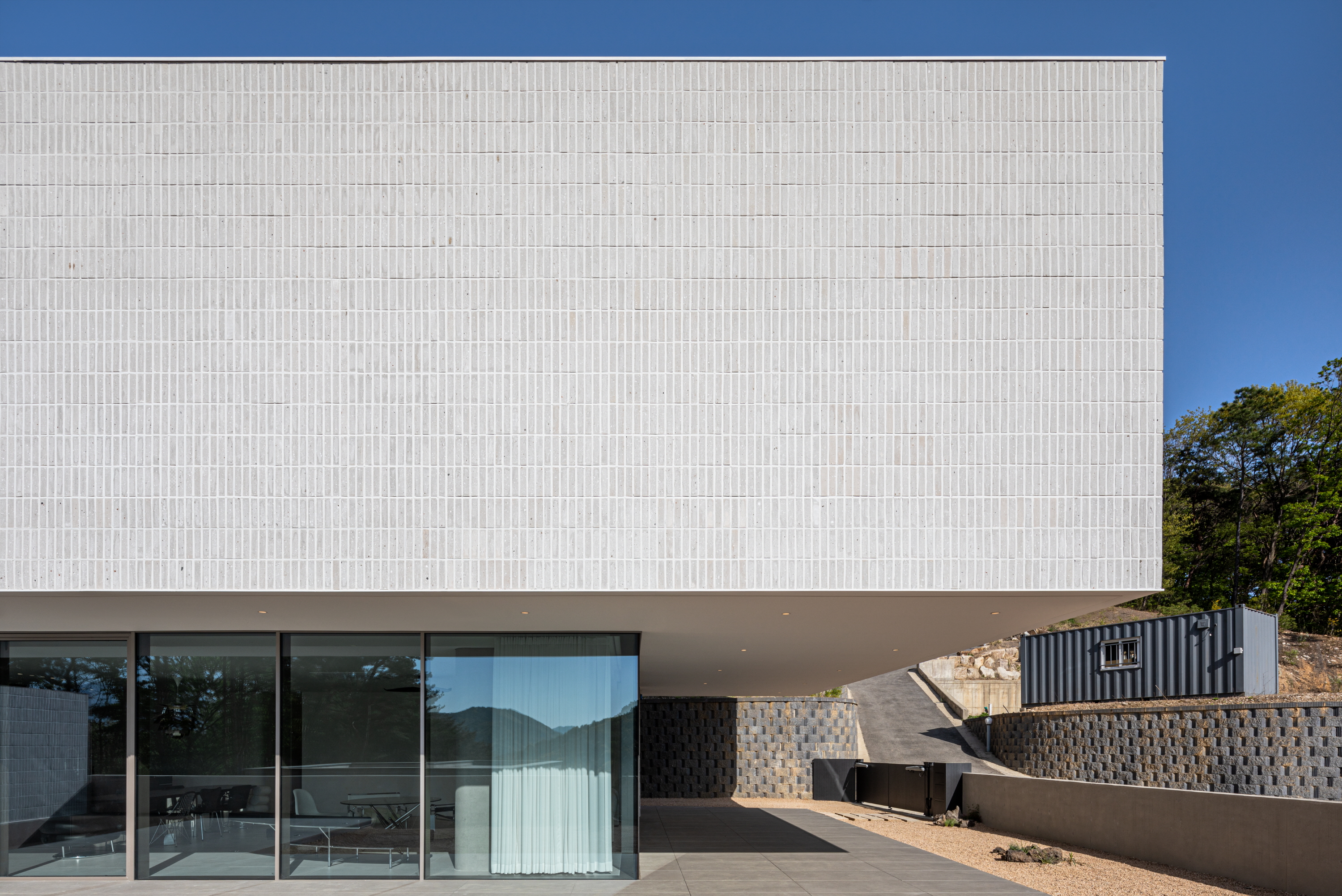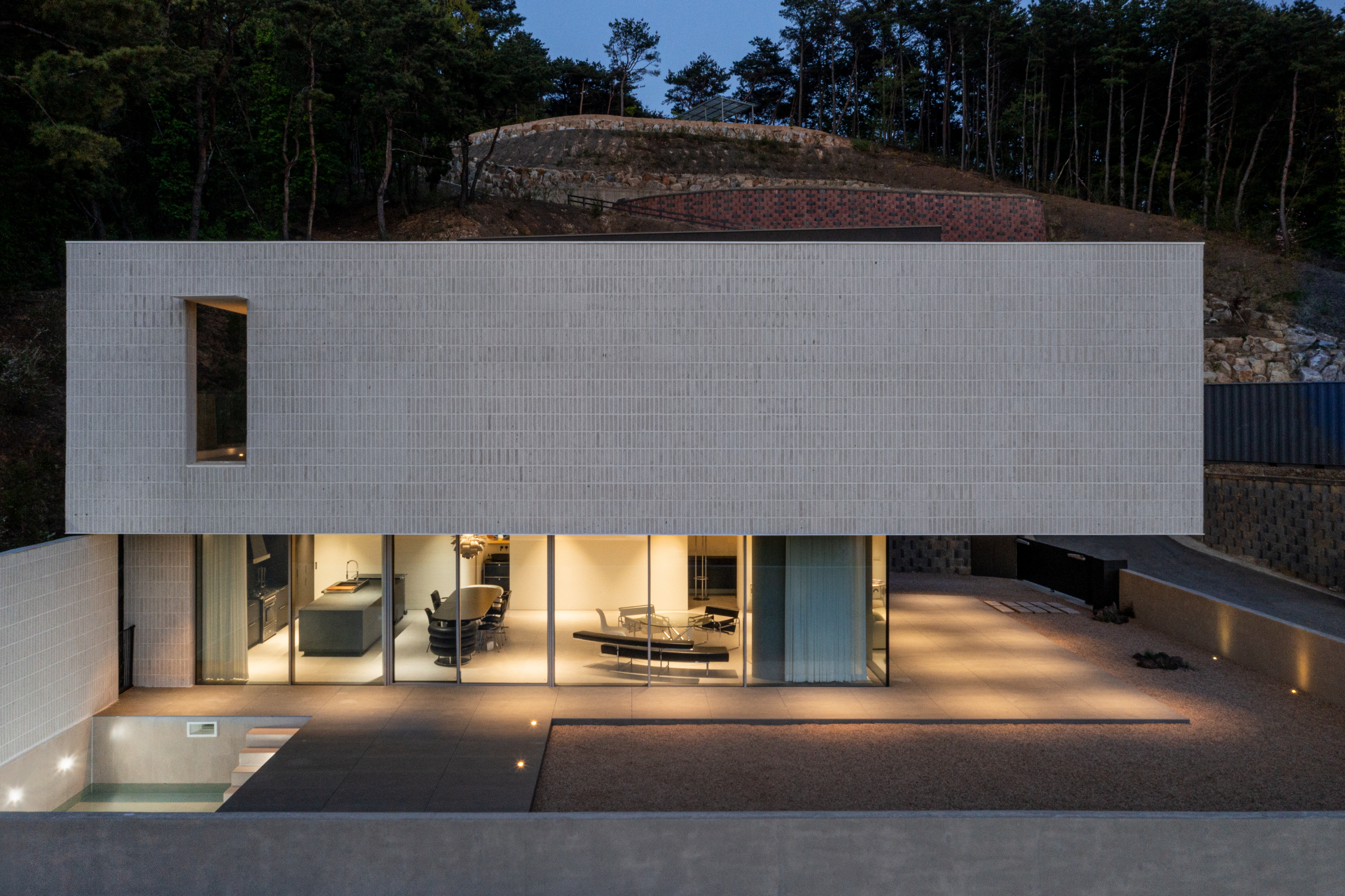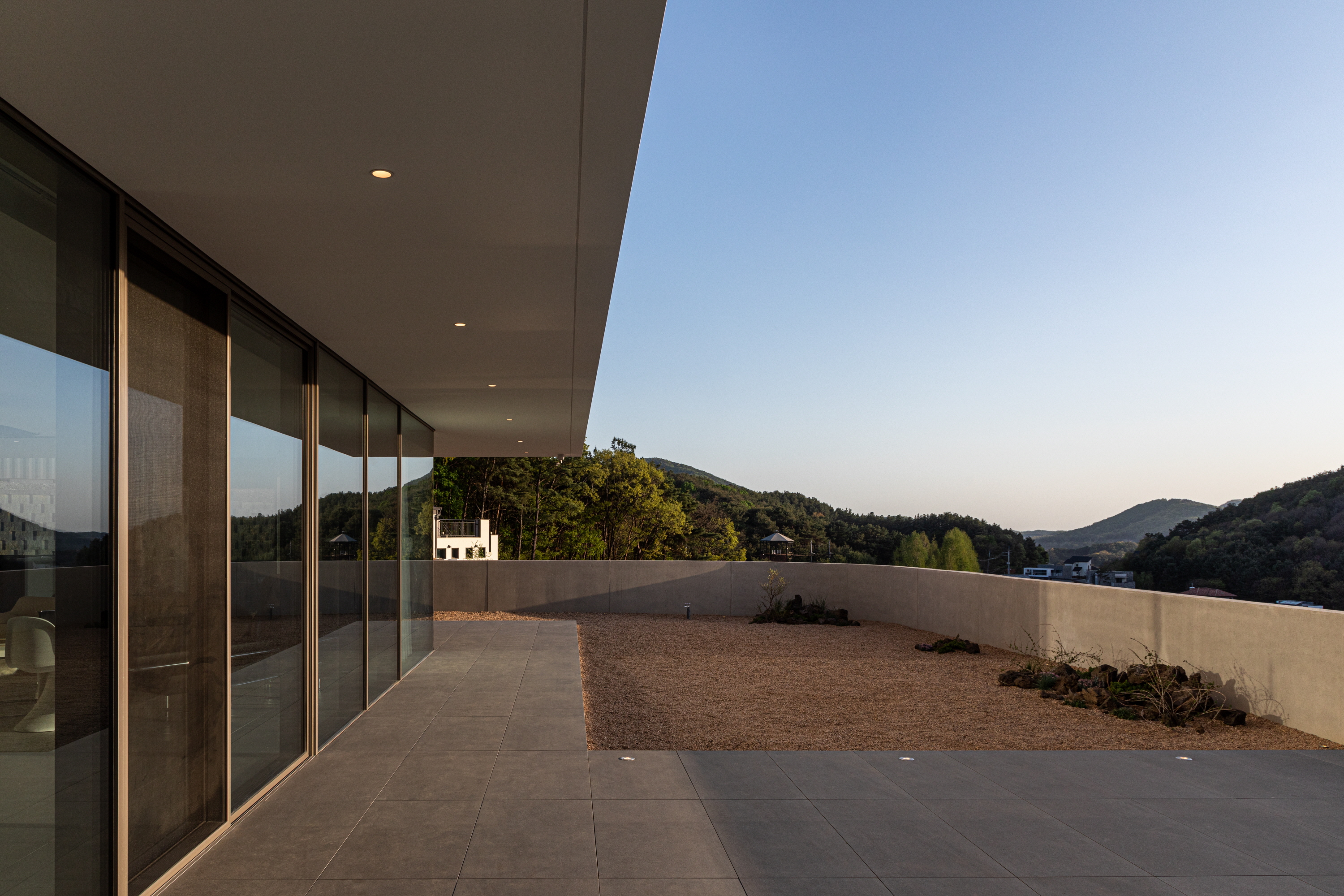 거실에서 마당을 바라보면 길게 내민 처마선과 기존의 보강토블록과 이격하여 구조적 부담을 주지 않도록 만들어진 노출콘크리트의 담장의 두 수평선 사이로 풍경이 파노라마처럼 펼쳐진다. 이 거실에 앉아 있으면 문득 풍경이 실내로 밀고 들어온다는 느낌을 만끽할 수 있다.