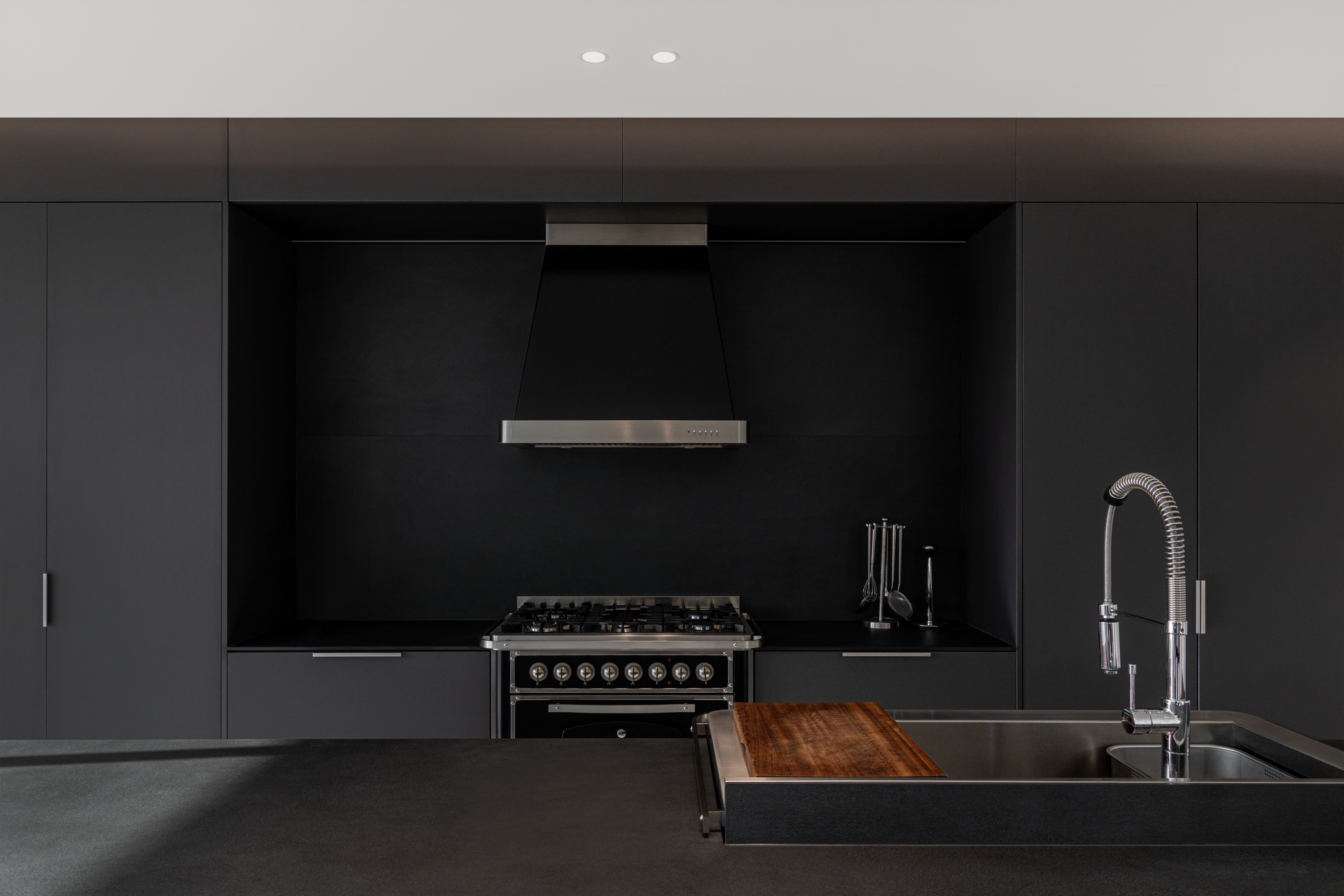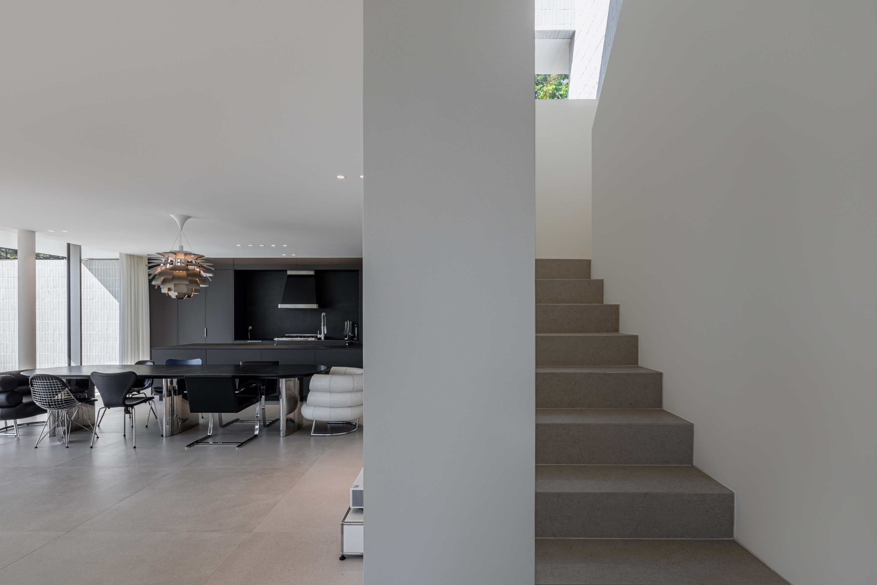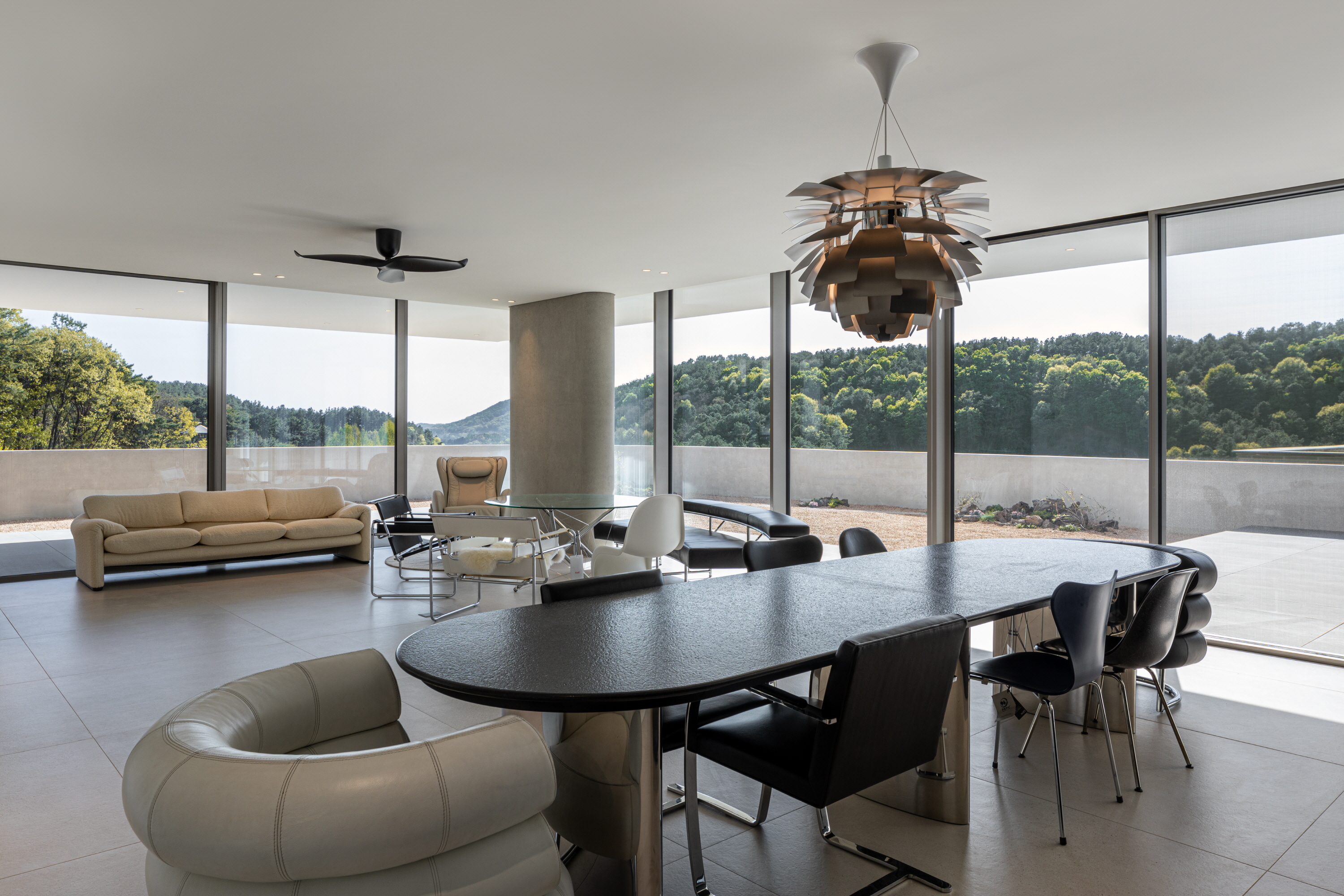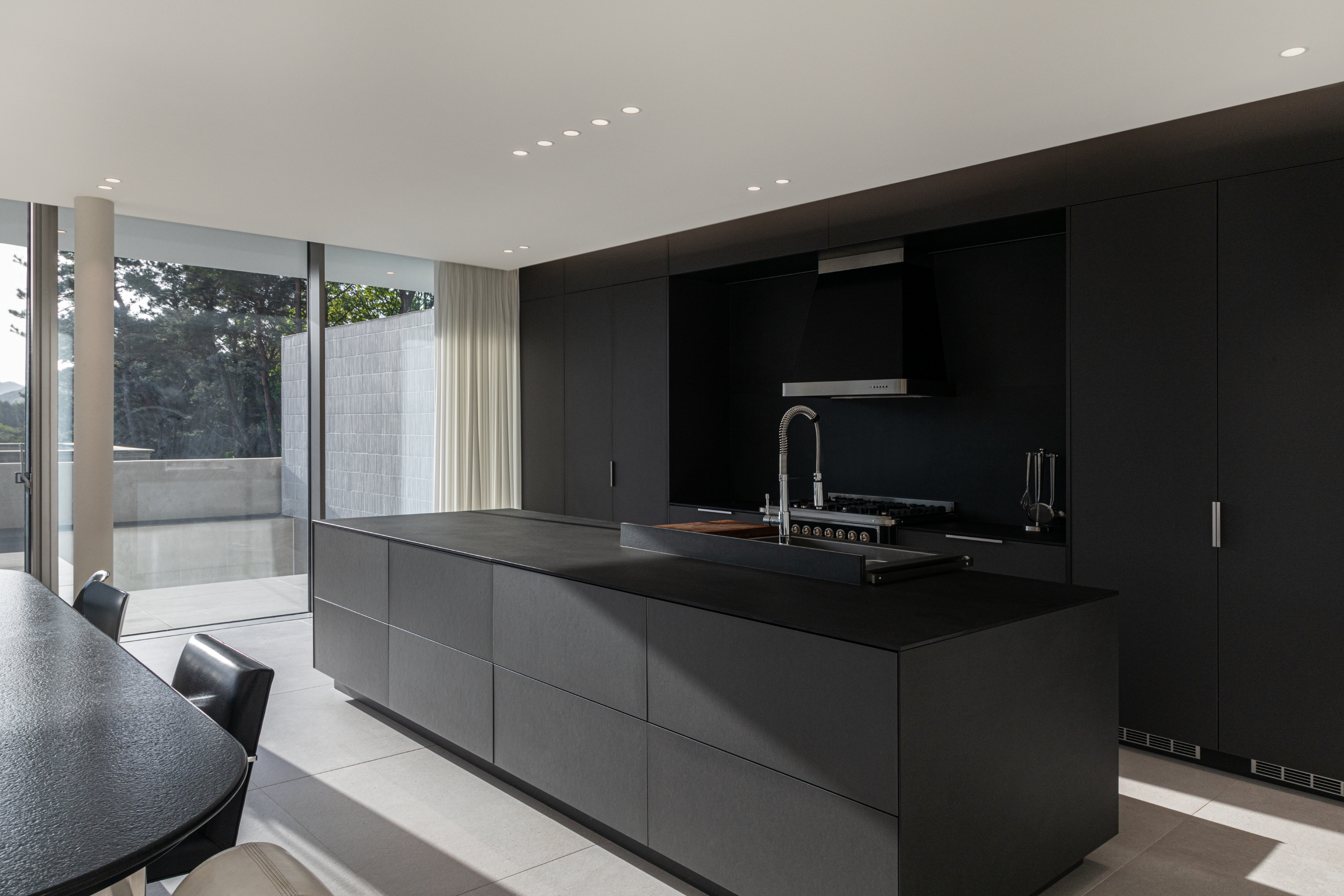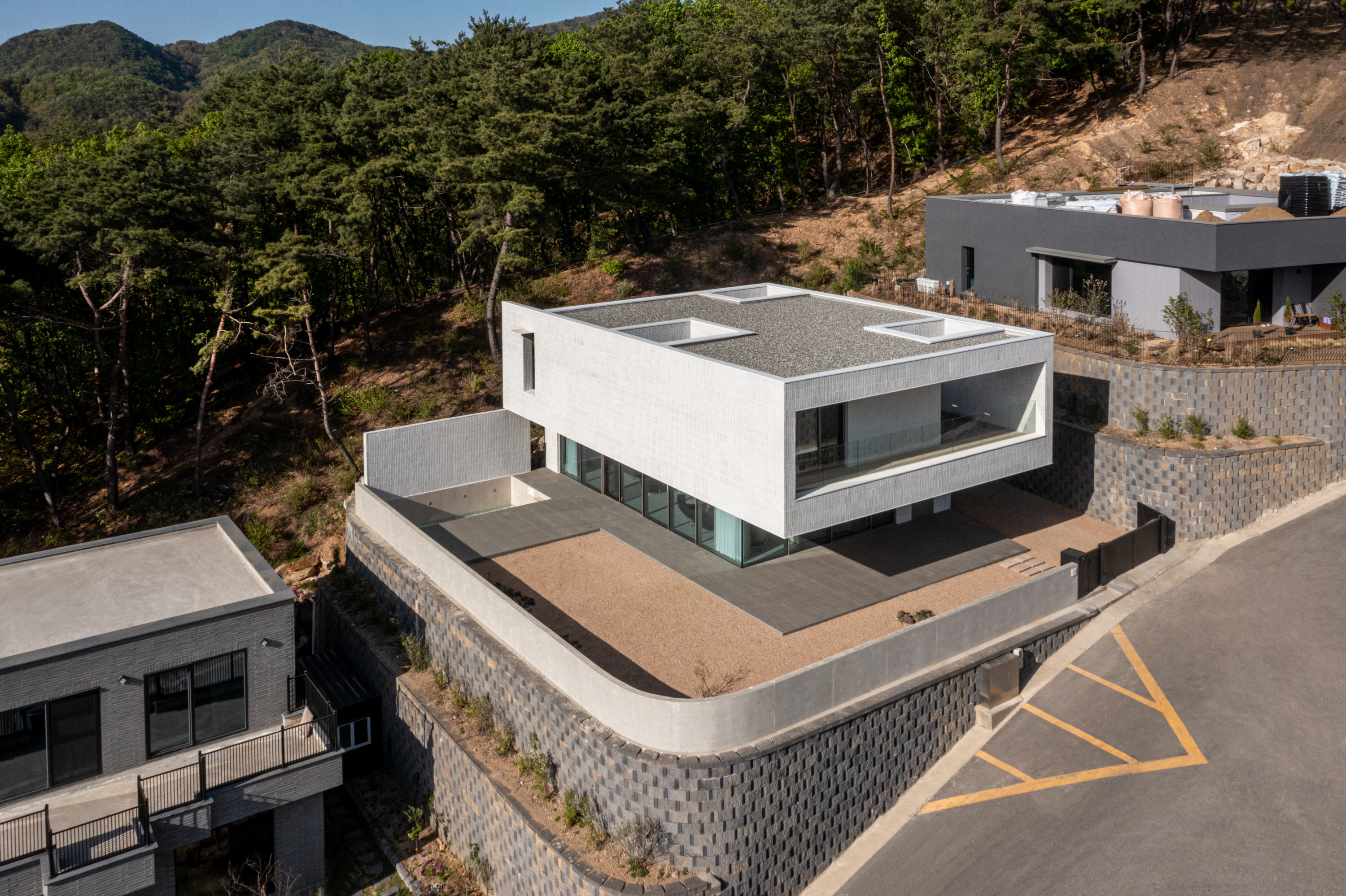 거실에서 마당을 바라보면 길게 내민 처마선과 기존의 보강토블록과 이격하여 구조적 부담을 주지 않도록 만들어진 노출콘크리트의 담장의 두 수평선 사이로 풍경이 파노라마처럼 펼쳐진다. 이 거실에 앉아 있으면 문득 풍경이 실내로 밀고 들어온다는 느낌을 만끽할 수 있다.