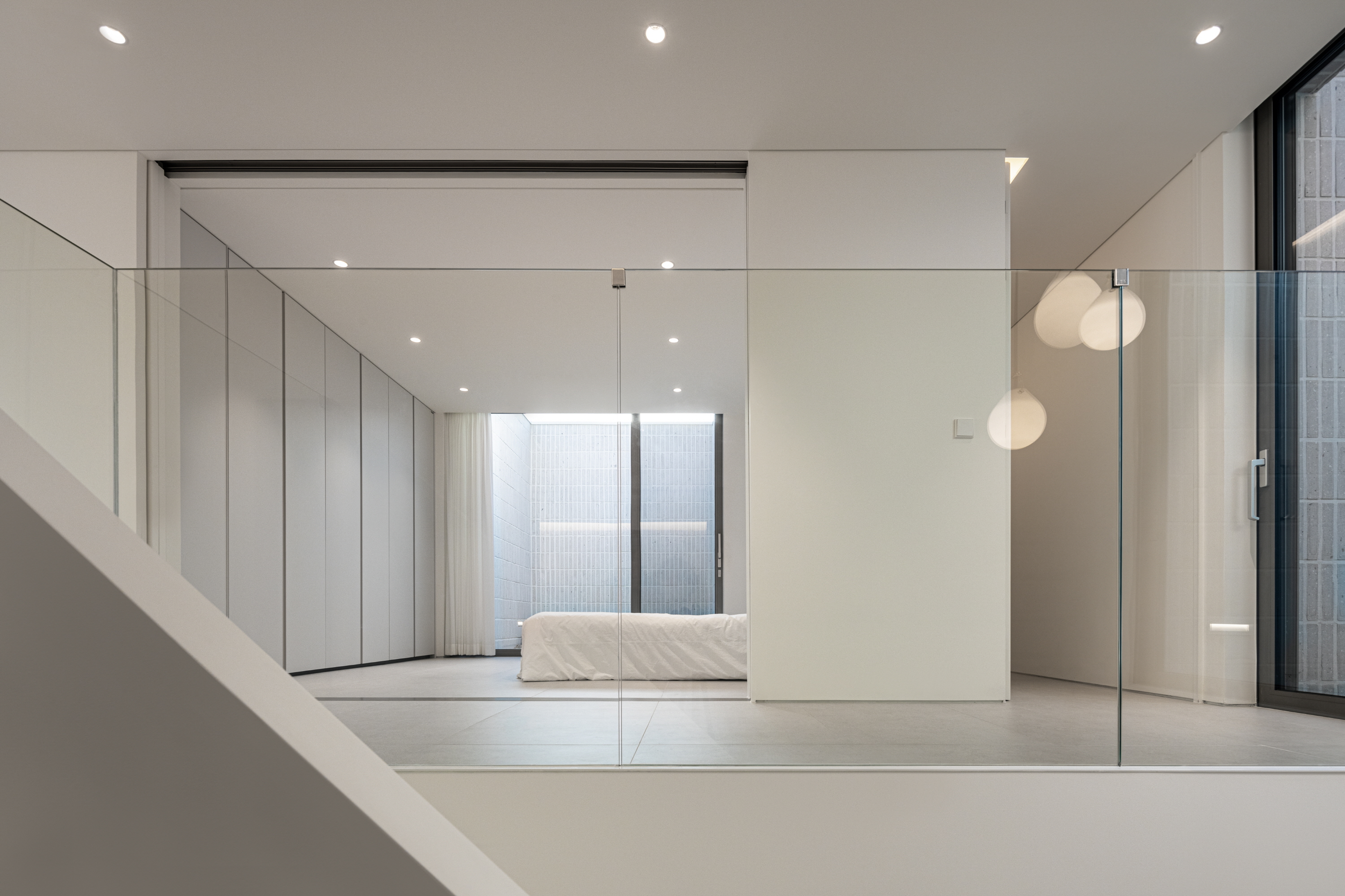 2층의 침실과 화장실들은 내밀한 박스 안에 비밀스런 중정들을 품고 있다. 2층까지 높은 천장으로 열린 현관은 캐주얼한 주말주택이었기에 과감하게 거실과 현관의 단차를 없앴다. 현관에서 곧바로 이어지는 계단을 통해 2층을 오를 때 3개의 중정들에 난 찬을 통해 외부에서는 얼핏 폐쇄적으로 보이는 박스와는 달리 환한 햇빛과 녹음이 들어오는 의외의 풍성한 열림을 선사한다.