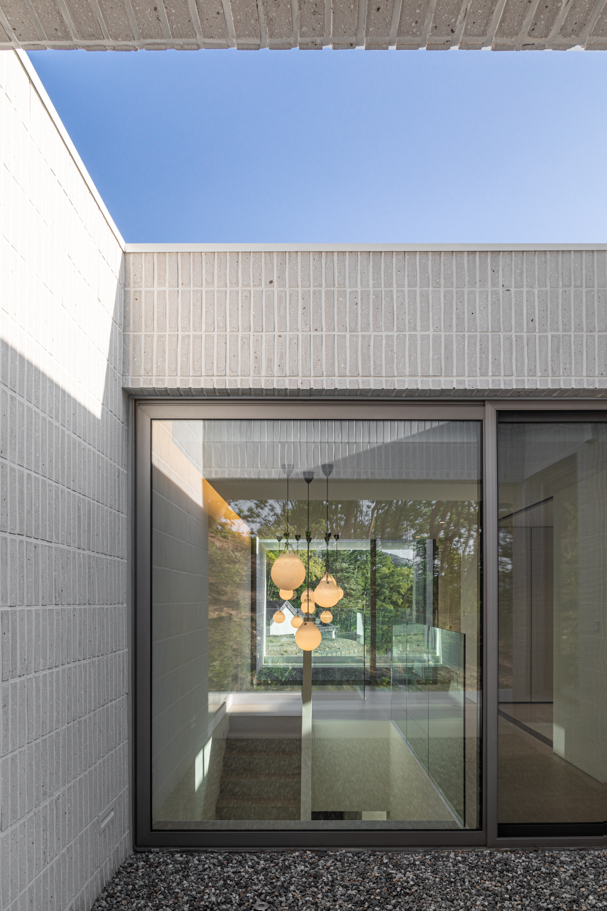2층의 침실과 화장실들은 내밀한 박스 안에 비밀스런 중정들을 품고 있다. 2층까지 높은 천장으로 열린 현관은 캐주얼한 주말주택이었기에 과감하게 거실과 현관의 단차를 없앴다. 현관에서 곧바로 이어지는 계단을 통해 2층을 오를 때 3개의 중정들에 난 찬을 통해 외부에서는 얼핏 폐쇄적으로 보이는 박스와는 달리 환한 햇빛과 녹음이 들어오는 의외의 풍성한 열림을 선사한다.