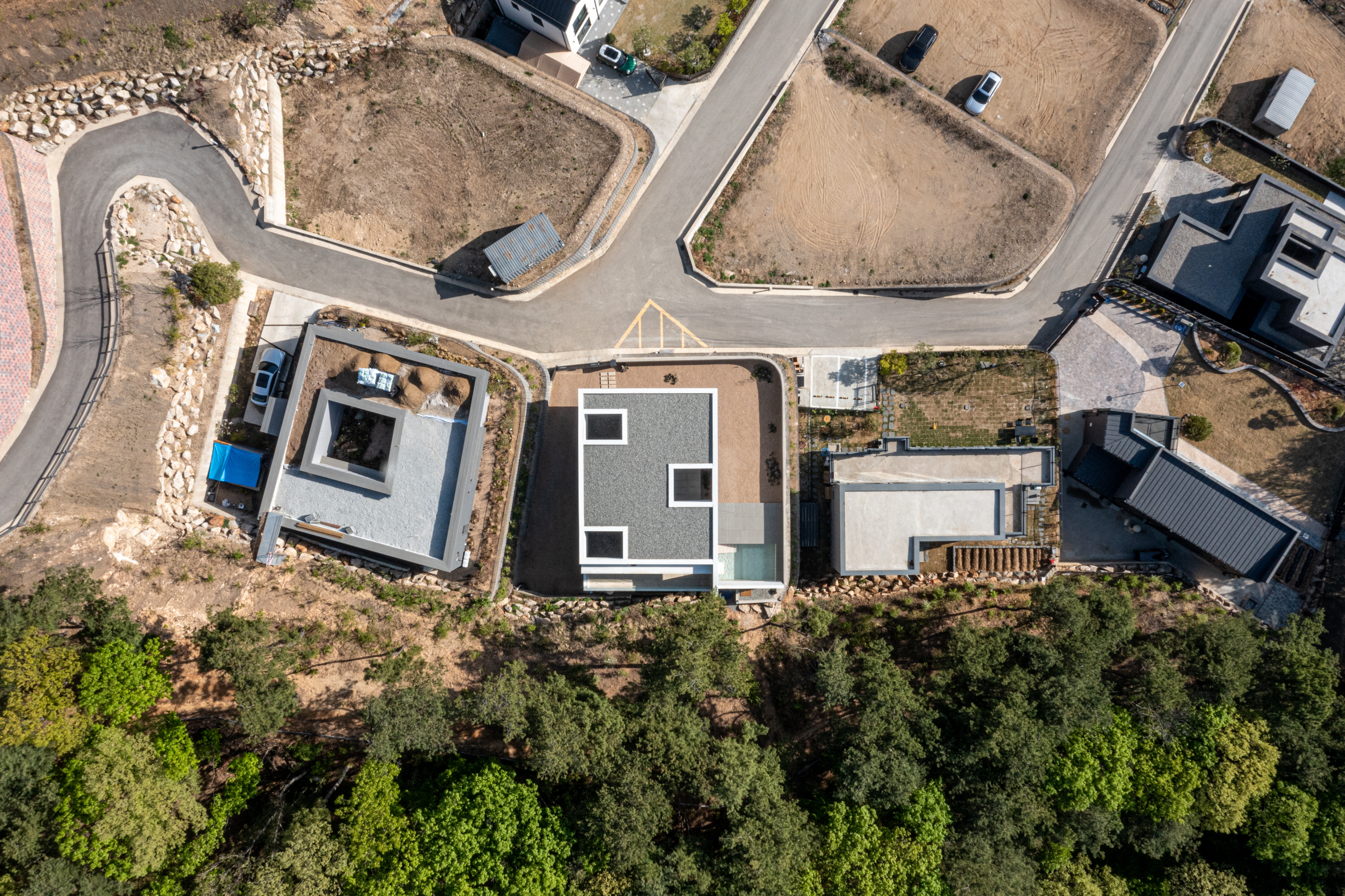 두 부부를 위한 주말주택. 네 분이 머리를 맞대고 지은 집 이름 양평사색은 四色과 思索을 의미한다. 사각의 떠 있는 매스와 숨겨진 사각의 중정들을 품고 있는 이 집에 더할 나위 없이 어 울리는 이름이다.
