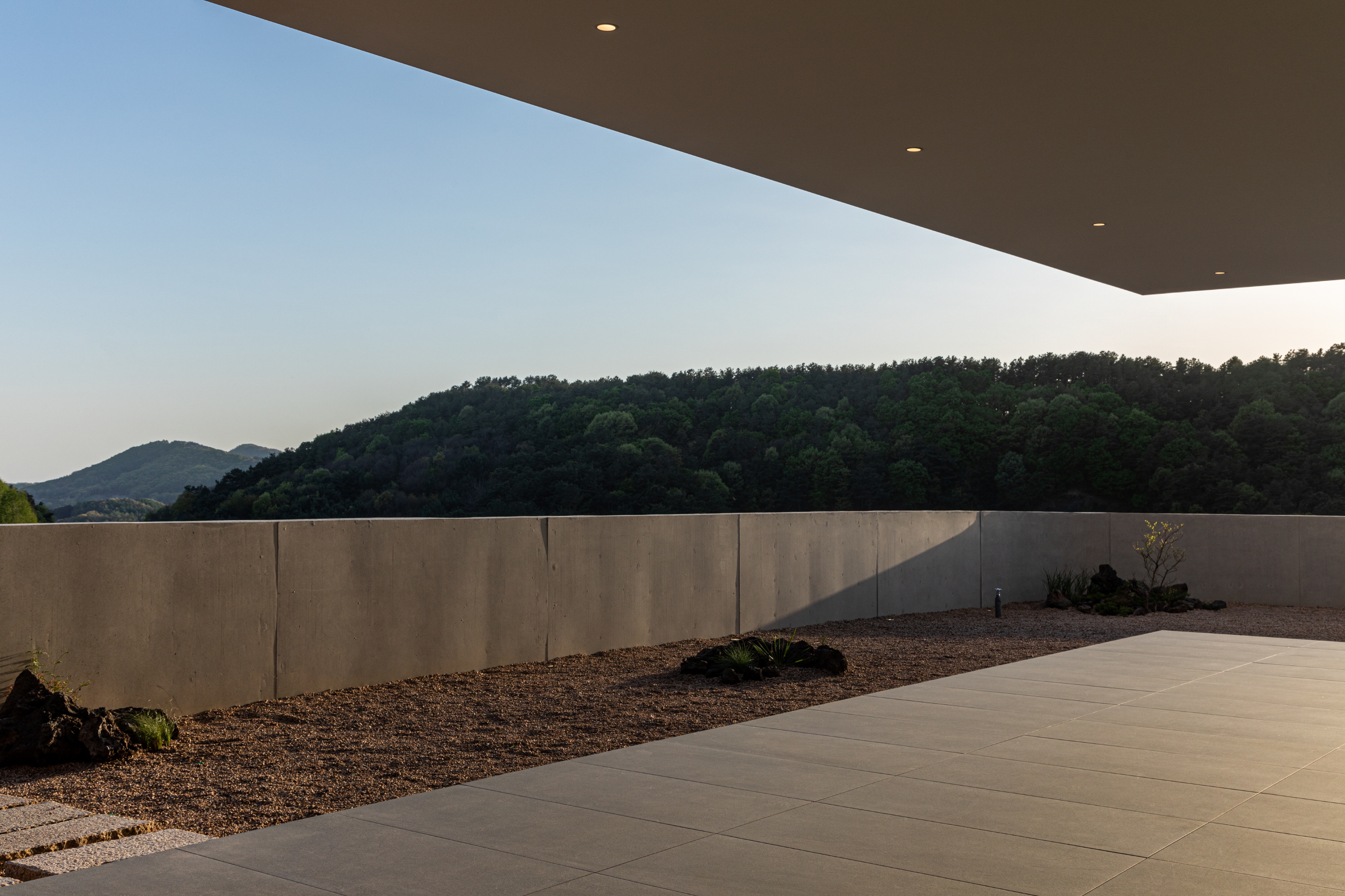 거실에서 마당을 바라보면 길게 내민 처마선과 기존의 보강토블록과 이격하여 구조적 부담을 주지 않도록 만들어진 노출콘크리트의 담장의 두 수평선 사이로 풍경이 파노라마처럼 펼쳐진다. 이 거실에 앉아 있으면 문득 풍경이 실내로 밀고 들어온다는 느낌을 만끽할 수 있다.