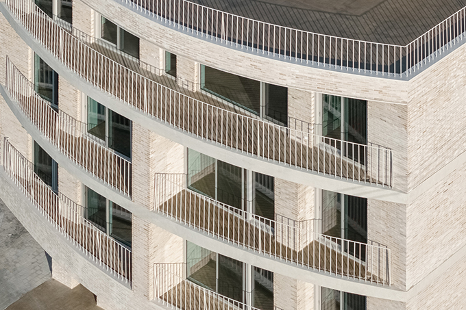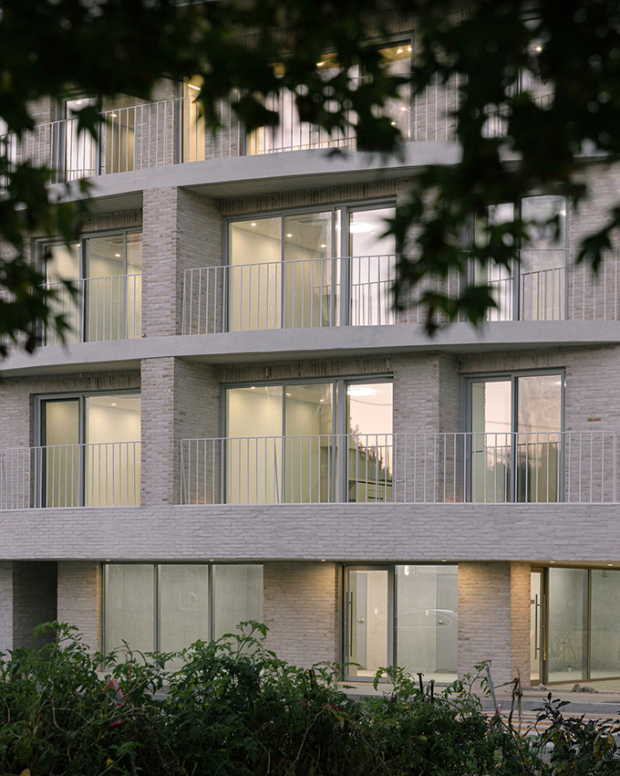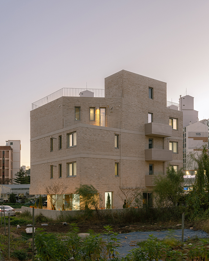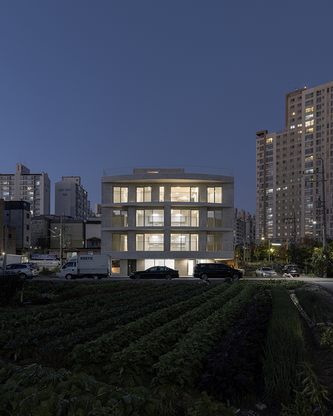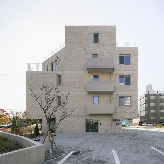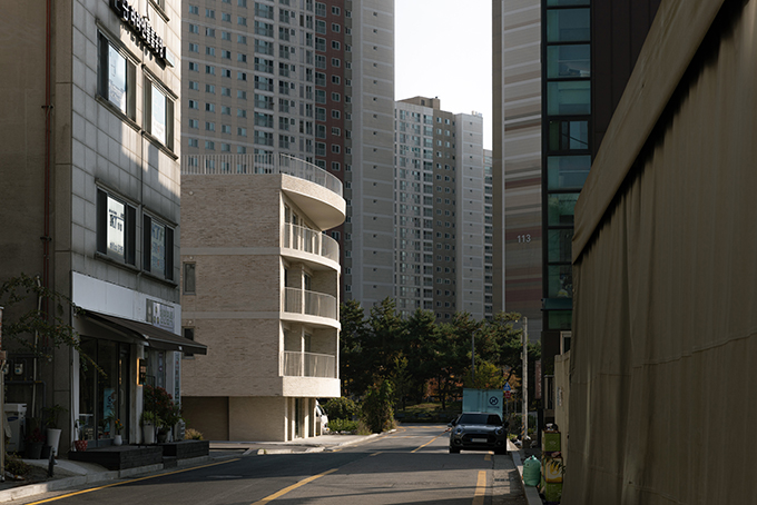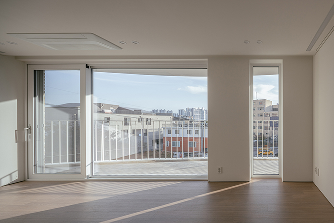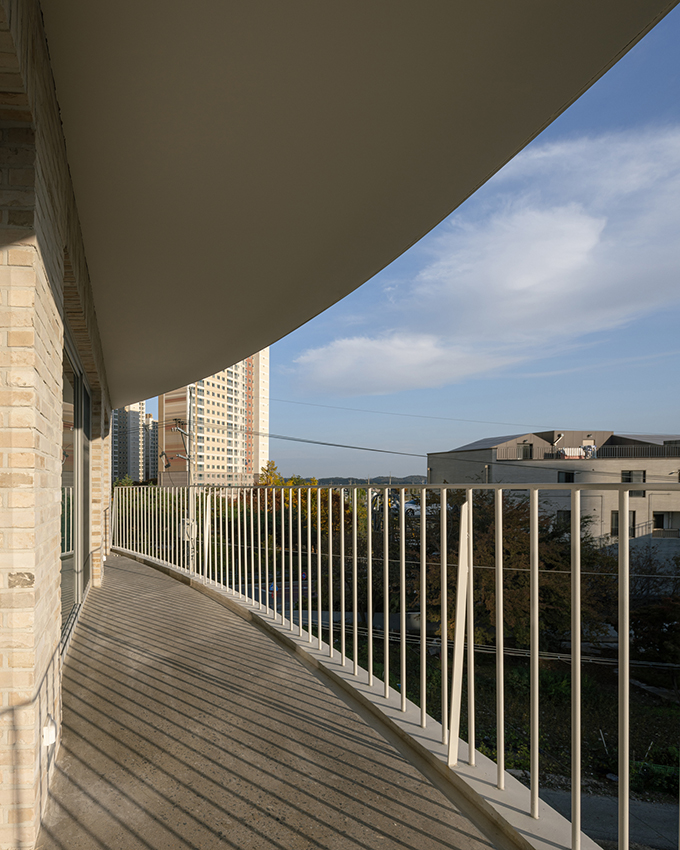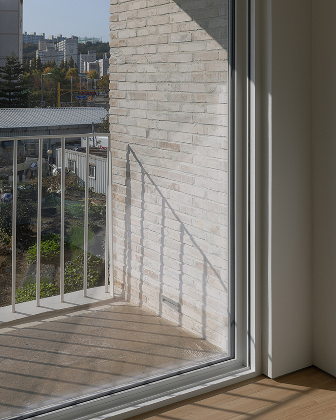 옛 필지와 도시계획에 따른 새로운 도로가 혼재하고 아직은 고즈넉한 풍광이 펼쳐지는 김포 사우동. 차량의 통행이 많지 않고 건너편 부지와 충분한 이격이 있는 땅이어서 충분히 여유로운 발코니를 계획할 수 있었다.