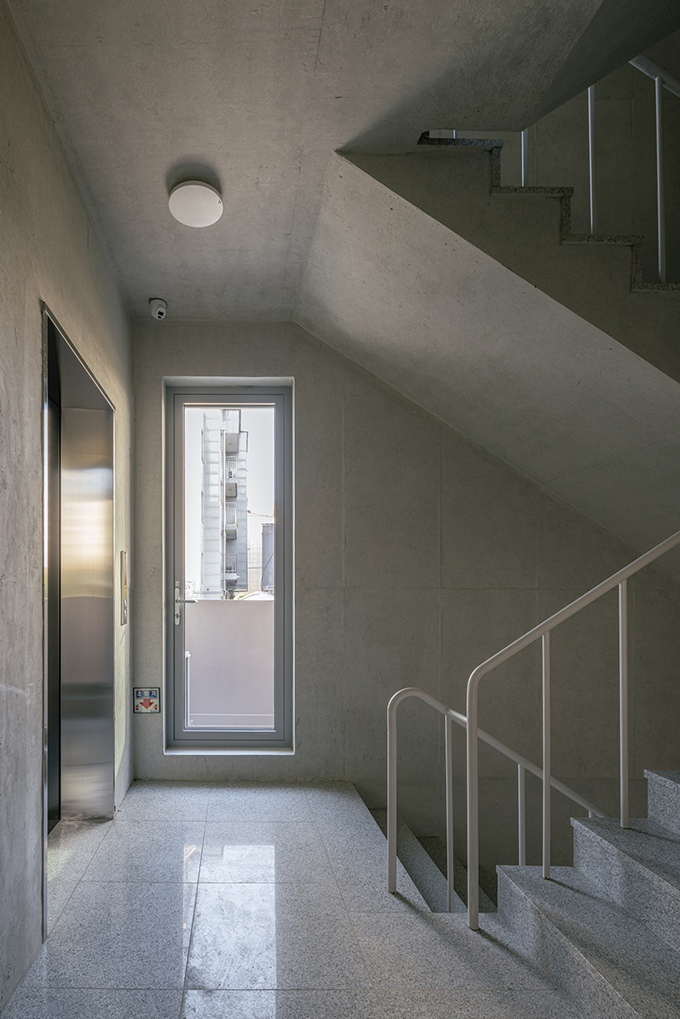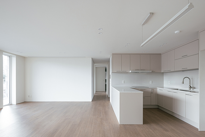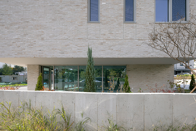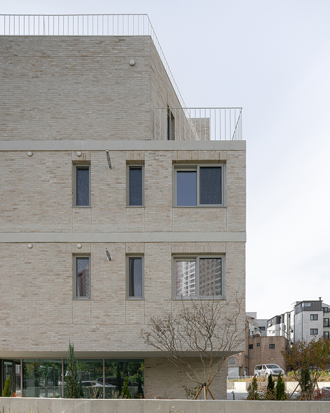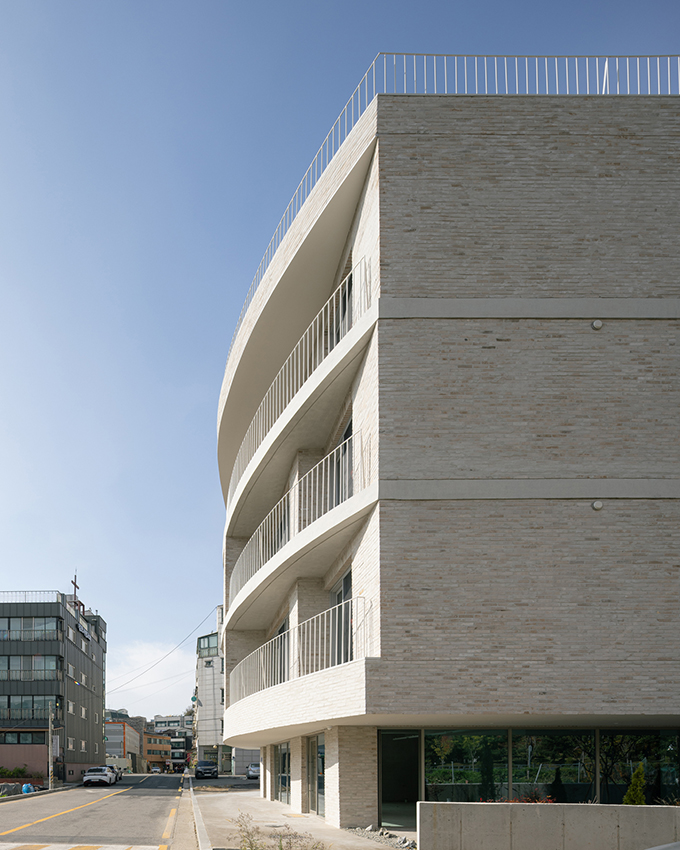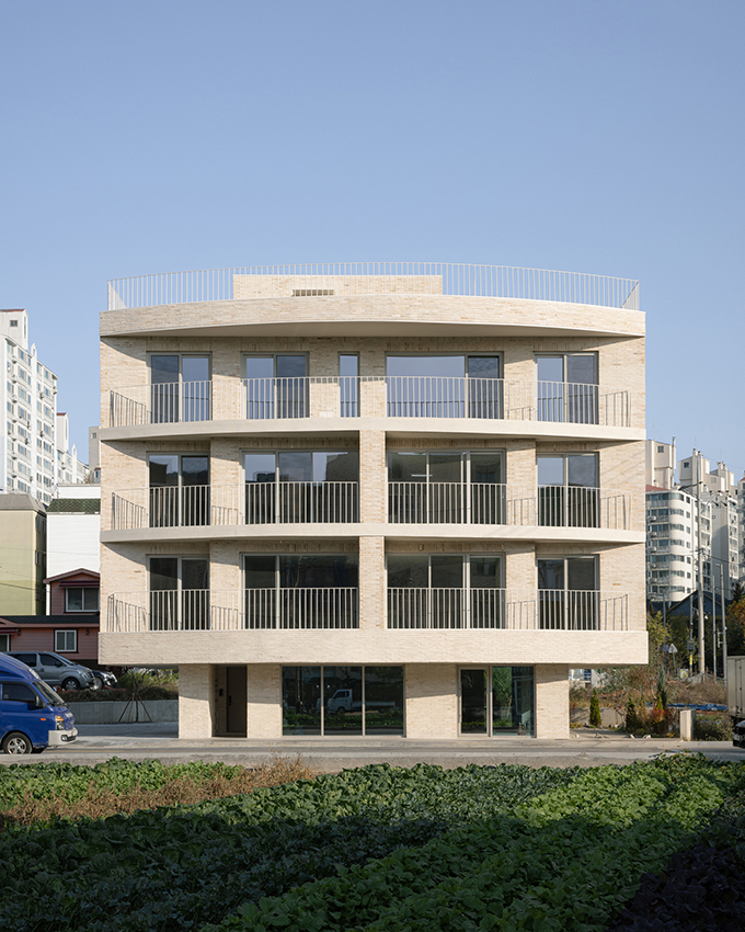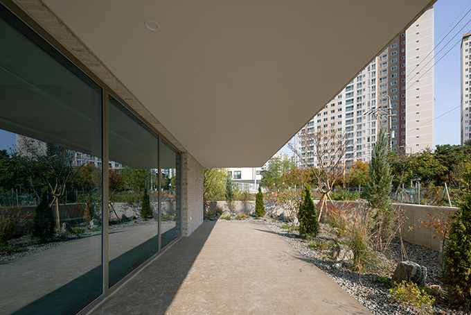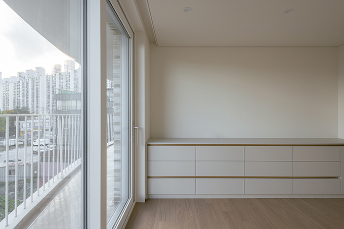 옛 필지와 도시계획에 따른 새로운 도로가 혼재하고 아직은 고즈넉한 풍광이 펼쳐지는 김포 사우동. 차량의 통행이 많지 않고 건너편 부지와 충분한 이격이 있는 땅이어서 충분히 여유로운 발코니를 계획할 수 있었다.