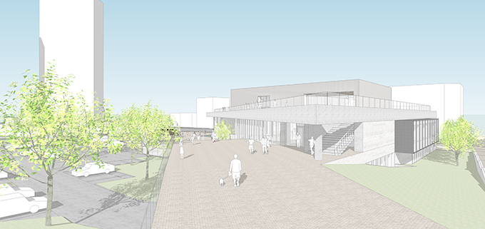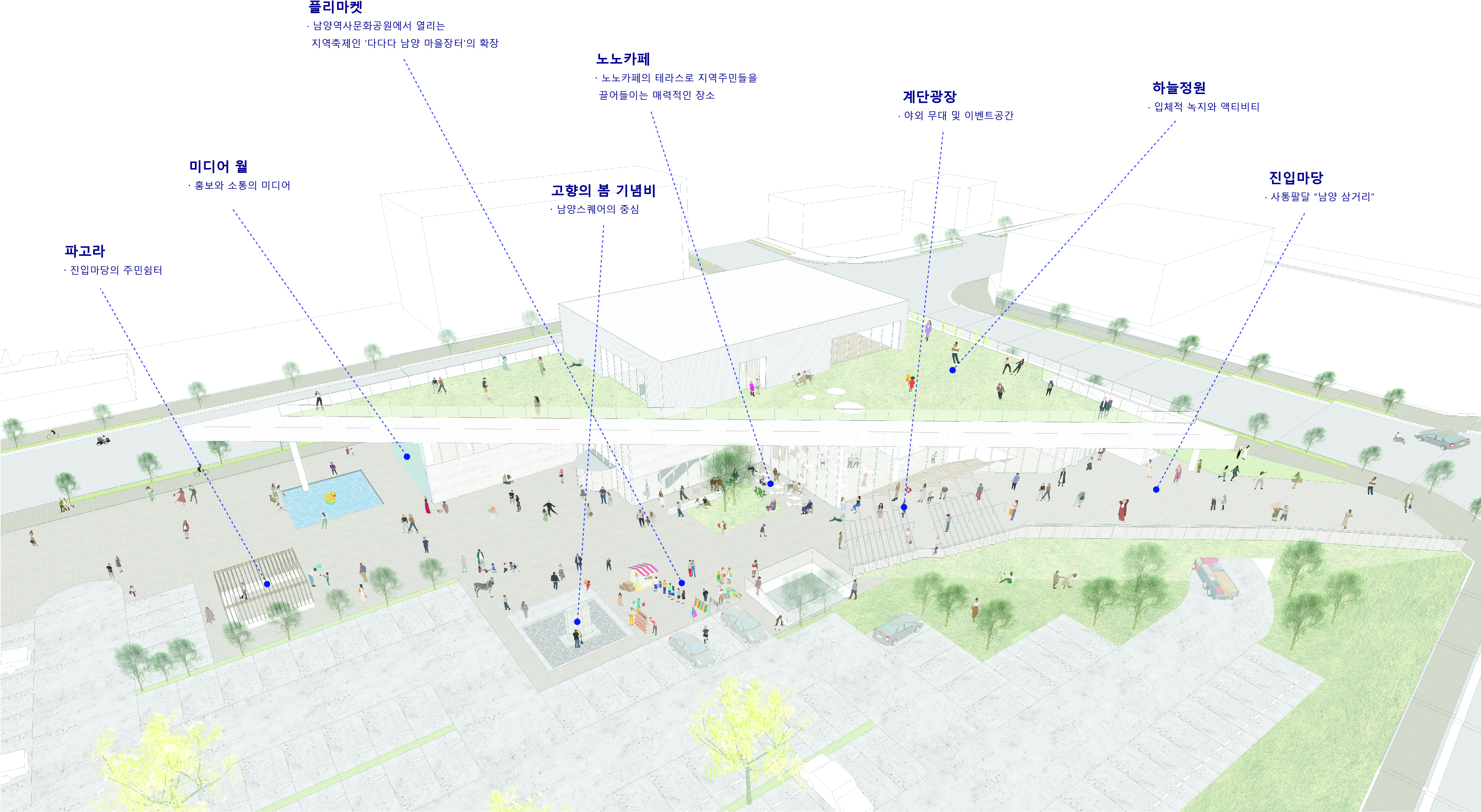 우리는 어떤 형태적 접근보다, 행정복지센터가 제공하는 기능과 프로그램 자체 보다, 마을과 마을을 연결하고 사람과 사람들이 교차하는 길과 마당의 가능성에 더 매료되었다. 그래서 대지의 중심이 되는 공간은 행정복지센터의 매스가 아니라 비워진 마당이길 원했다. 하늘에서 보았을 때 삼각형으로 보이는 형태는 행복센터의 매스가 마당에게 중심을 비워주고 한쪽으로 비껴난 배치의 결과다.