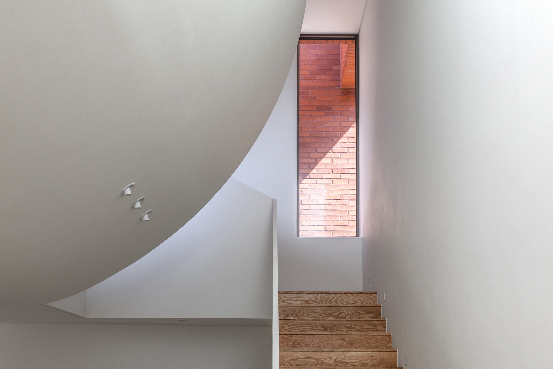 옆집은 옆집대로 남향을 바라보며 조망이 열려 있기에 이 집의 프라이버시를 위한 장치는 명분이 있어 보였다. 다만 가리는 역할을 하되 그저 벽이 아니었으면 했다. 그 벽 안쪽에 있게 될 테라스는 르 코르뷔지에나 가우디의 옥상만큼은 아니어도 아이들이 즐겁게 나와서 쉴 수 있는 테라스로 만들자. 루이자 메이 올콧의 소설 ‘작은 아씨들’이 저절로 생각났던 네 자매들 (물론 이 집의 아버지는 남북전쟁에 참전한 소설 속 아버지와 달리 일찍 퇴근해 집으로 온다.) 이 주로 지낼 2층에서 언제든 나와 마당의 엄마와 가까운 마을 풍경, 멀리 북한강과 그 너머까지 바라보는 모습을 그려보았다. 그렇게 건축주의 요청은 단순한 벽이 아닌 타원의 곡선으로 올라가는 바닥과 벽의 중간 성격을 가진 무엇이 되었다. 이 곡선은 실내에서는 천장의 곡면으로, 외부의 테라스에서는 바닥이 융기한 기댈 수 있는 벽으로 경험된다. 2층으로 올라가는 계단과 부족한 오전의 채광을 확보해주는 고창도, 테라스로 나가기 전 비를 가려주는 처마 아래의 공간도 모두 이 곡선의 볼륨 안에 들어 있다. 언젠가 소녀들은 이 작은 둥지 (little nest) 같은 공간에서 만곡의 벽돌에 비스듬하게 기대어 해바라기를 하리라.