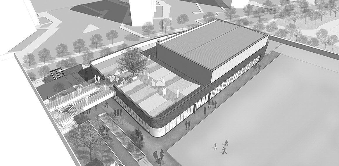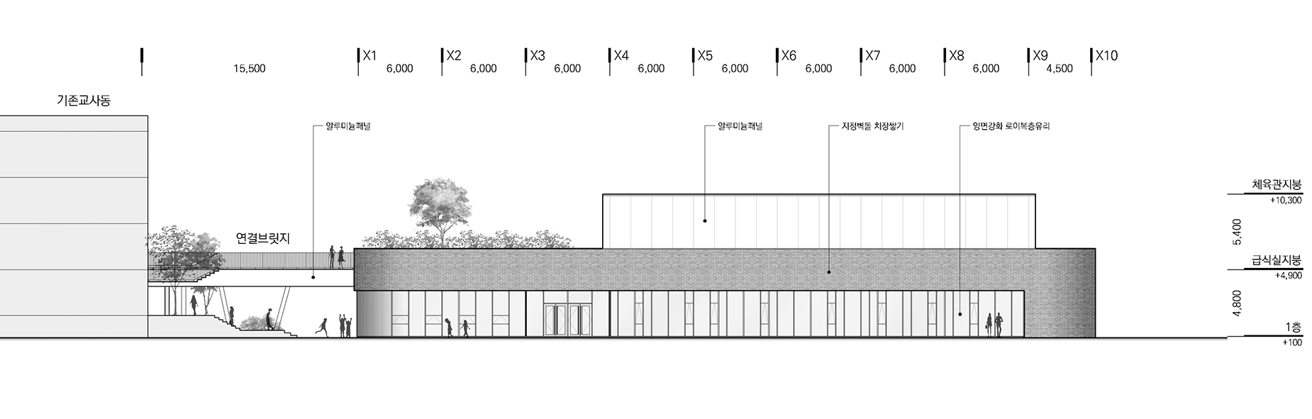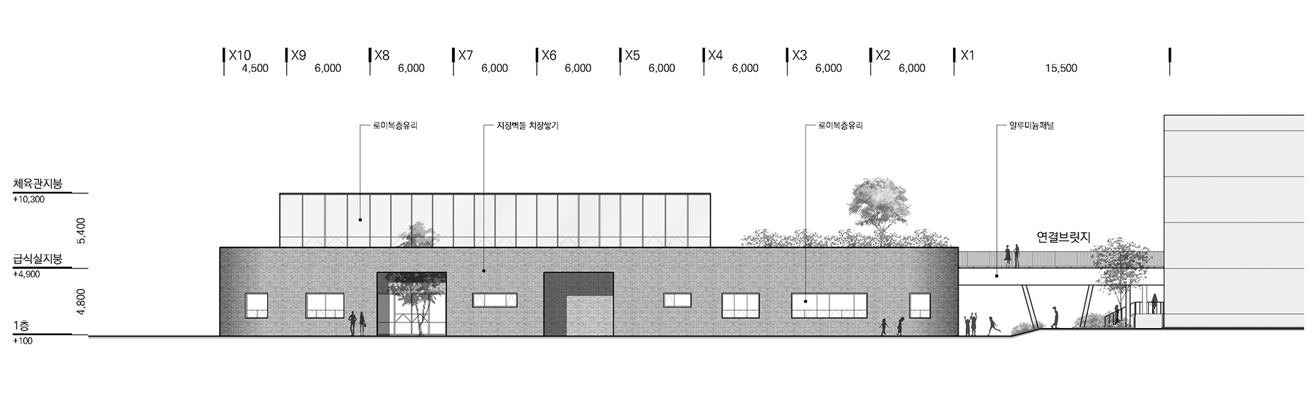 교육청에서 요구하는 프로그램은 1층에 식당을 두고 2층이 다목적강당이 되는 것이었지만, 어떻게든 1층이 되어야 한다고 생각했고 그것에 집중했다.
