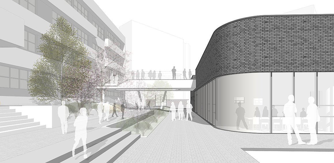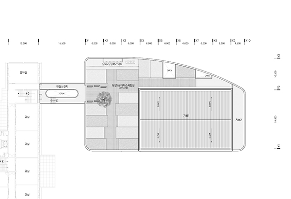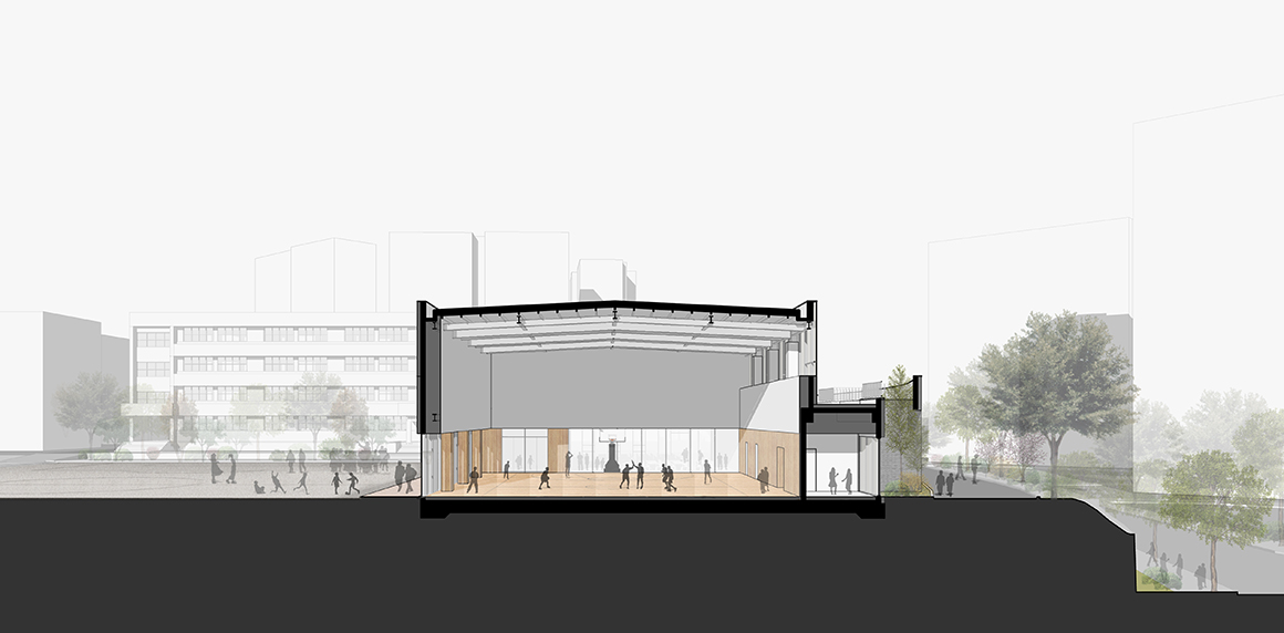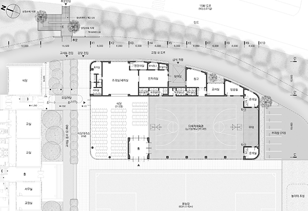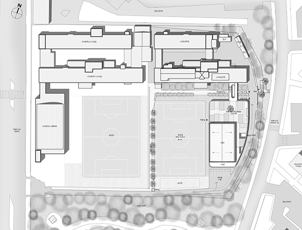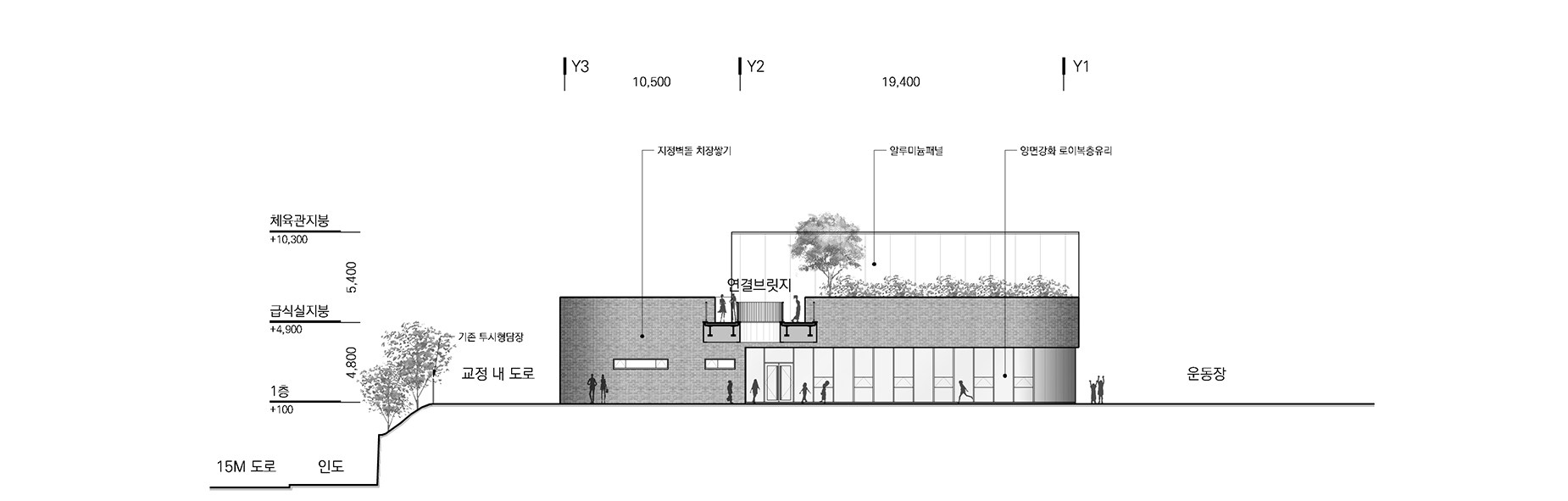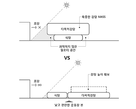 교육청에서 요구하는 프로그램은 1층에 식당을 두고 2층이 다목적강당이 되는 것이었지만, 어떻게든 1층이 되어야 한다고 생각했고 그것에 집중했다.