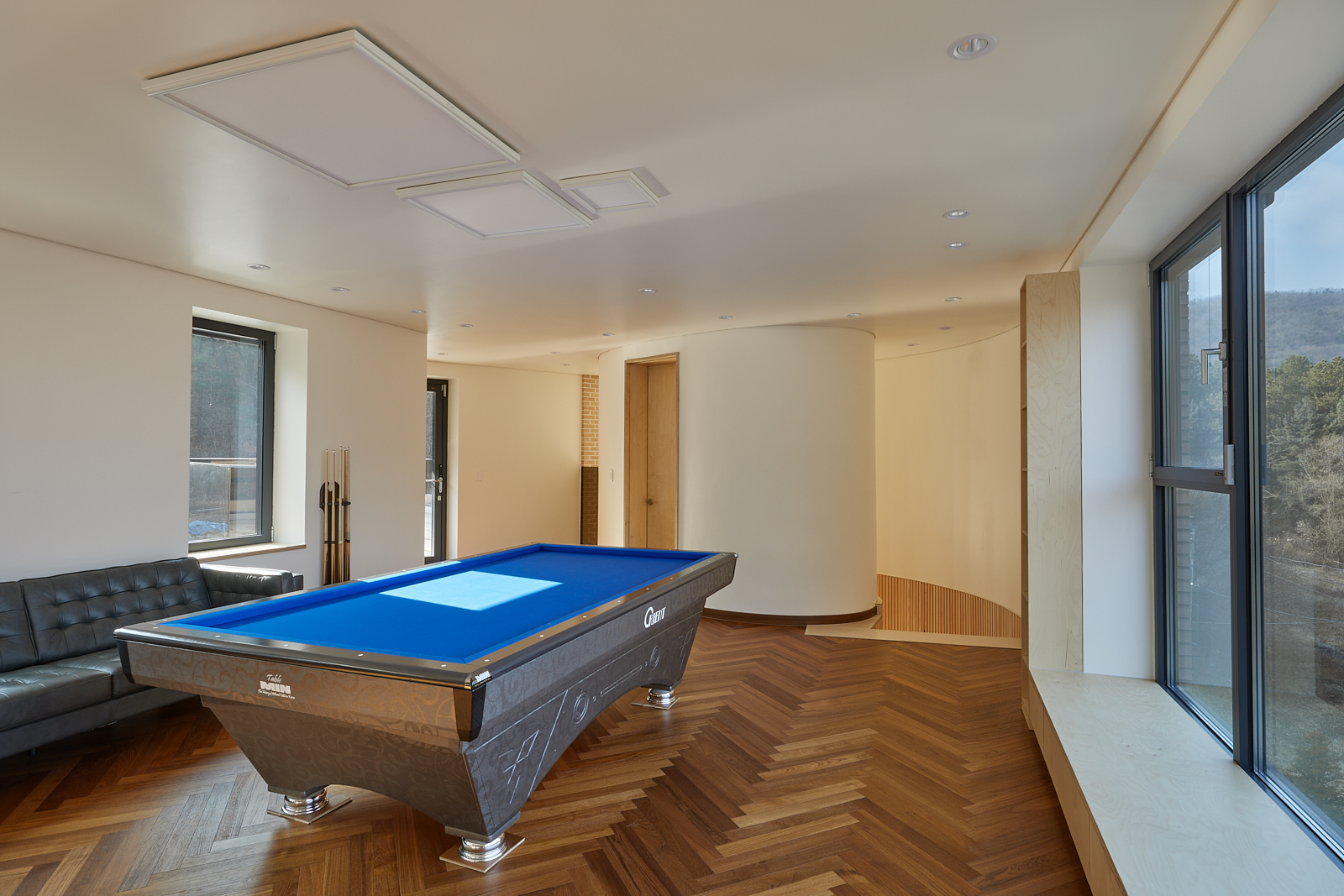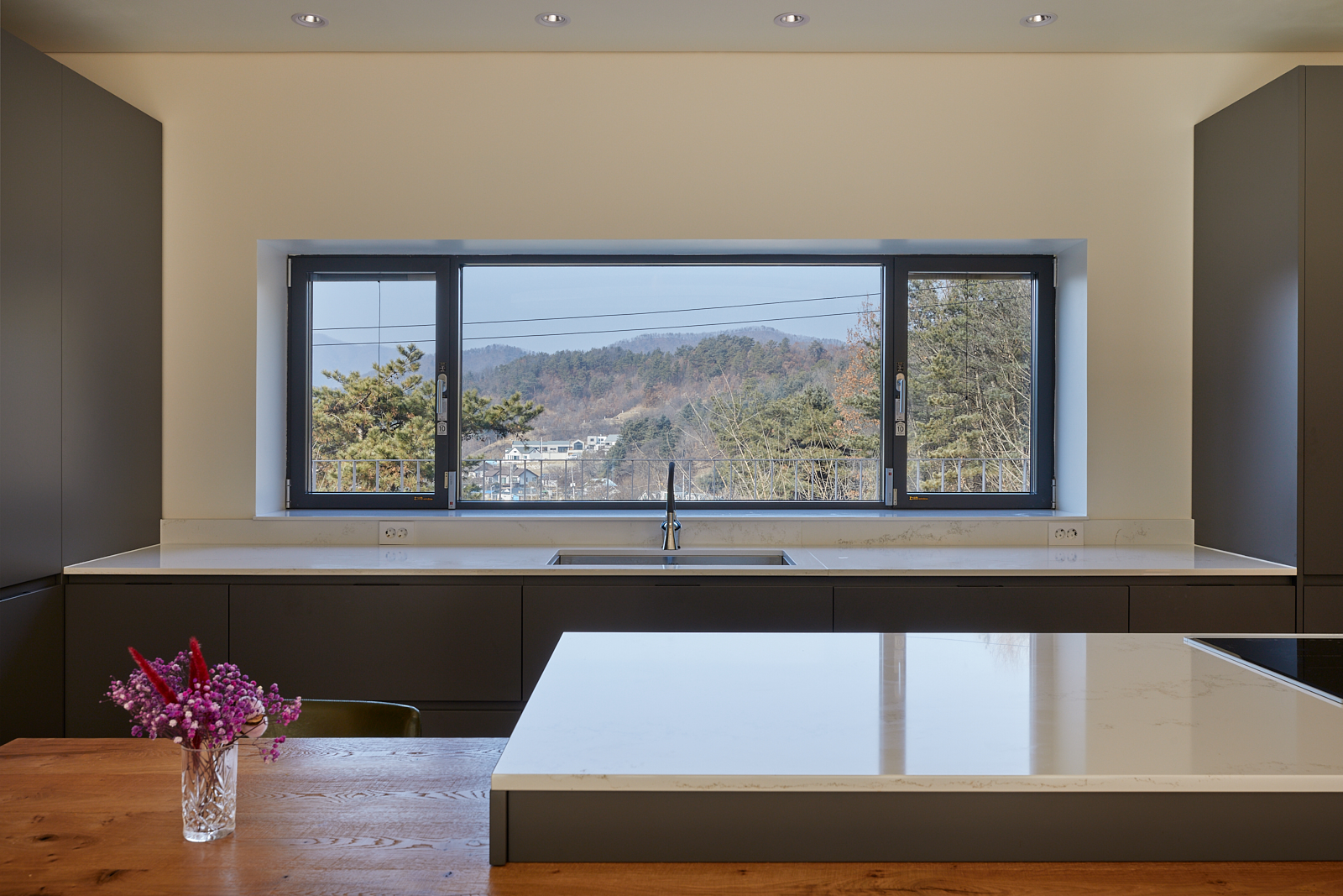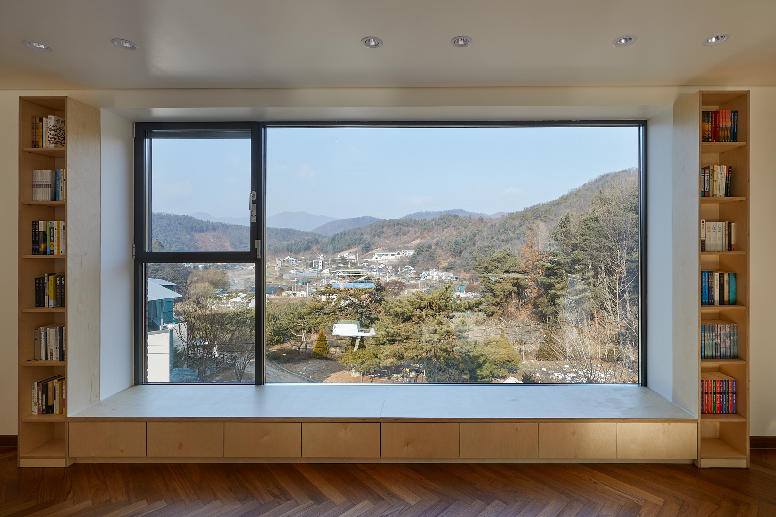 도로에서 대지가 이미 4.5미터 가량 높기 때문에 거기에 2층 높이를 올리는 것이 부담스러웠다. 건축주가 요구한 2층의 프로그램을 1층으로 넓게 깔아서 그렸다. 산세에 가능한 순응하는 낮고 넓게 펼쳐진 집. 벌려진 손가락 같은 집의 마디마디로 자연이 스며드는 집. 안됩니다, 지금은 없지만 언제라도 저 북쪽 대지에 다른 집이 들어서면 북쪽 풍광이 가려질 수 있어요, 2층이 되어야 이 경치를 방해 받지 않고 바라볼 수 있어요. 낮고 넓게 펼쳐진 1층 집 폐기.