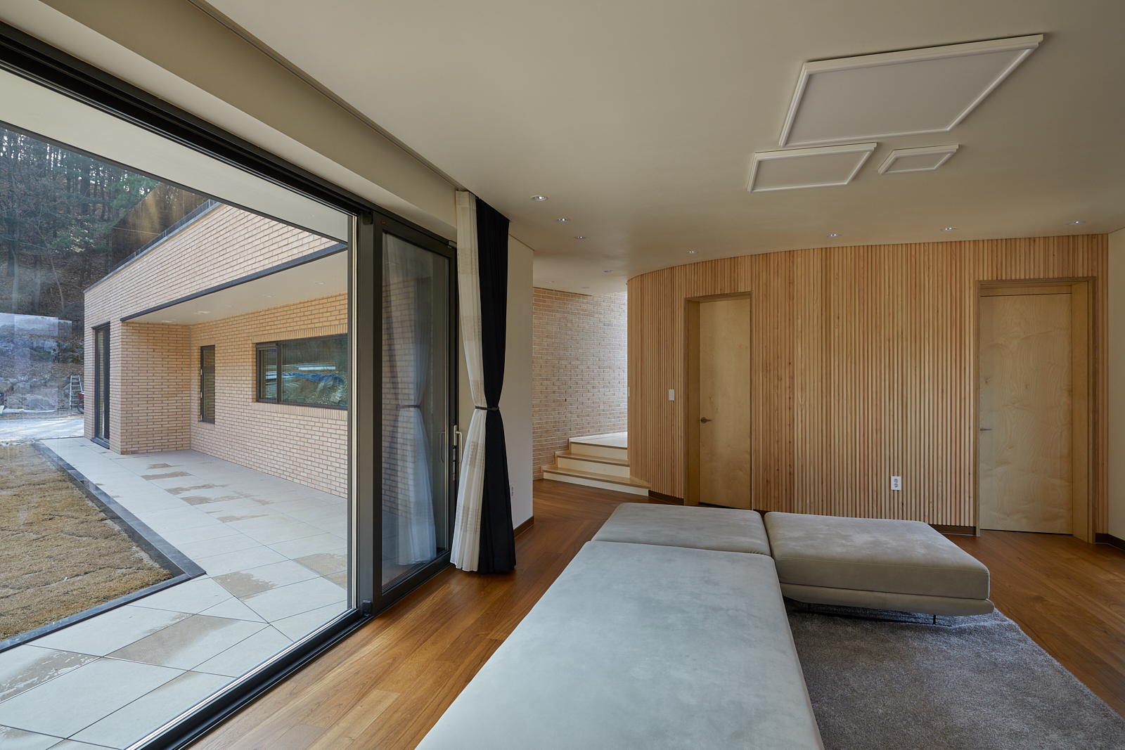 양평군 서종면은 강을 끼고 동쪽으로 펼쳐지지만 산세가 낮아도 뚜렷하고 골짜기가 제법 깊은 동네다. 북이 아니라 남쪽으로 산을 바라보고 있는 마을도 꽤 된다. 건축주가 고심 끝에 고른 땅은 서종면을 동서로 달리는 중미산로에서 쑥 들어와 두세 번 꺾어져 길이 끝나고 산자루가 시작되는 곳, 도시로 치면 막다른 골목길 같은 곳에 있었다. 땅은 이미 주택을 짓기 위해 경사진 땅을 돋우고 꽤나 부담스러운 옹벽을 쌓아 놓은 상태였다. 대지의 북쪽에서 진입하며 커다란 옹벽의 오른편 경사로로 대지에 올라서면 남쪽으로 깊고 조용한 산이 의연하고, 돌아서면 북쪽으로 낮고 넓게 서종면 마을이 펼쳐진 풍광을 볼 수 있었다. 남향으로 산이 있는 것 치고 볕은 아쉽지 않게 들어왔고, 오후 햇살은 오래 머물 터였다.