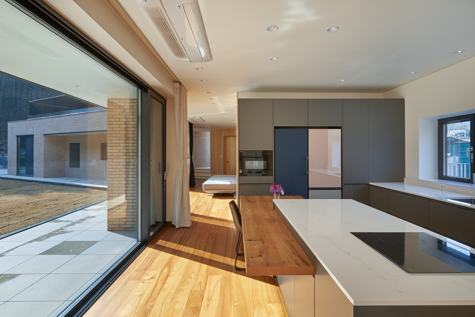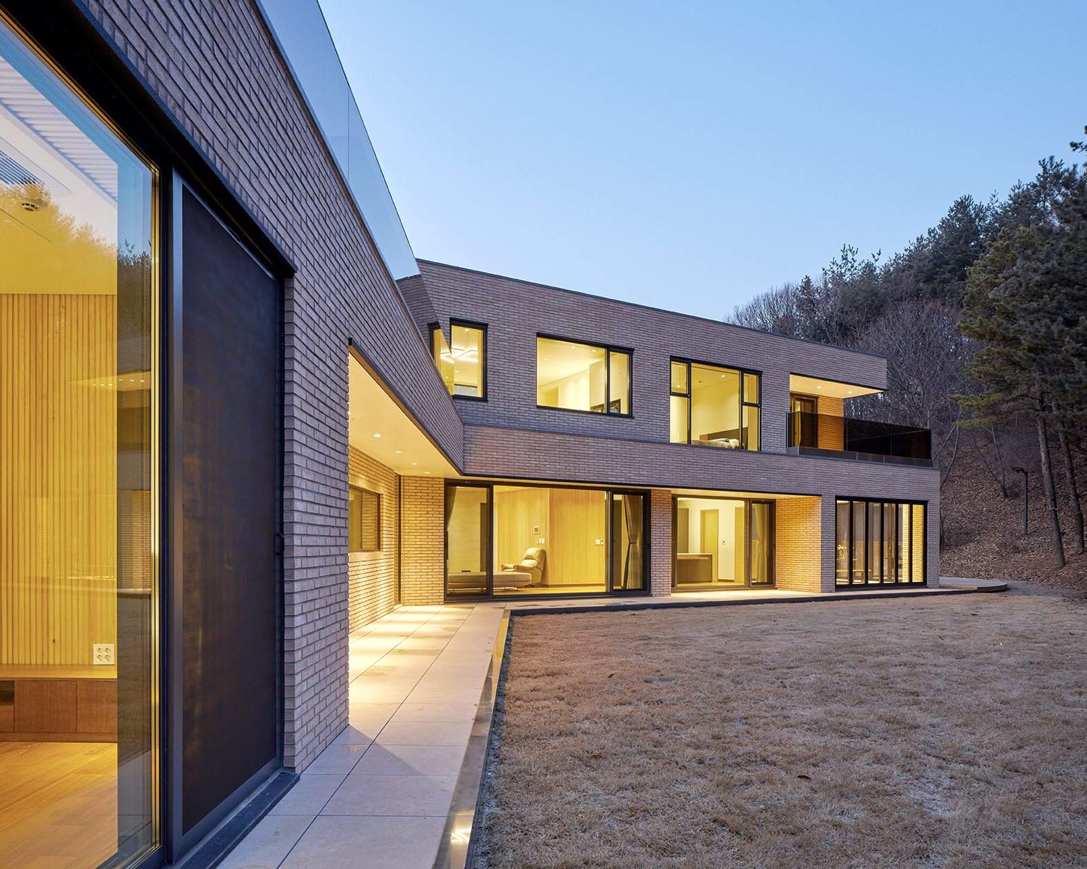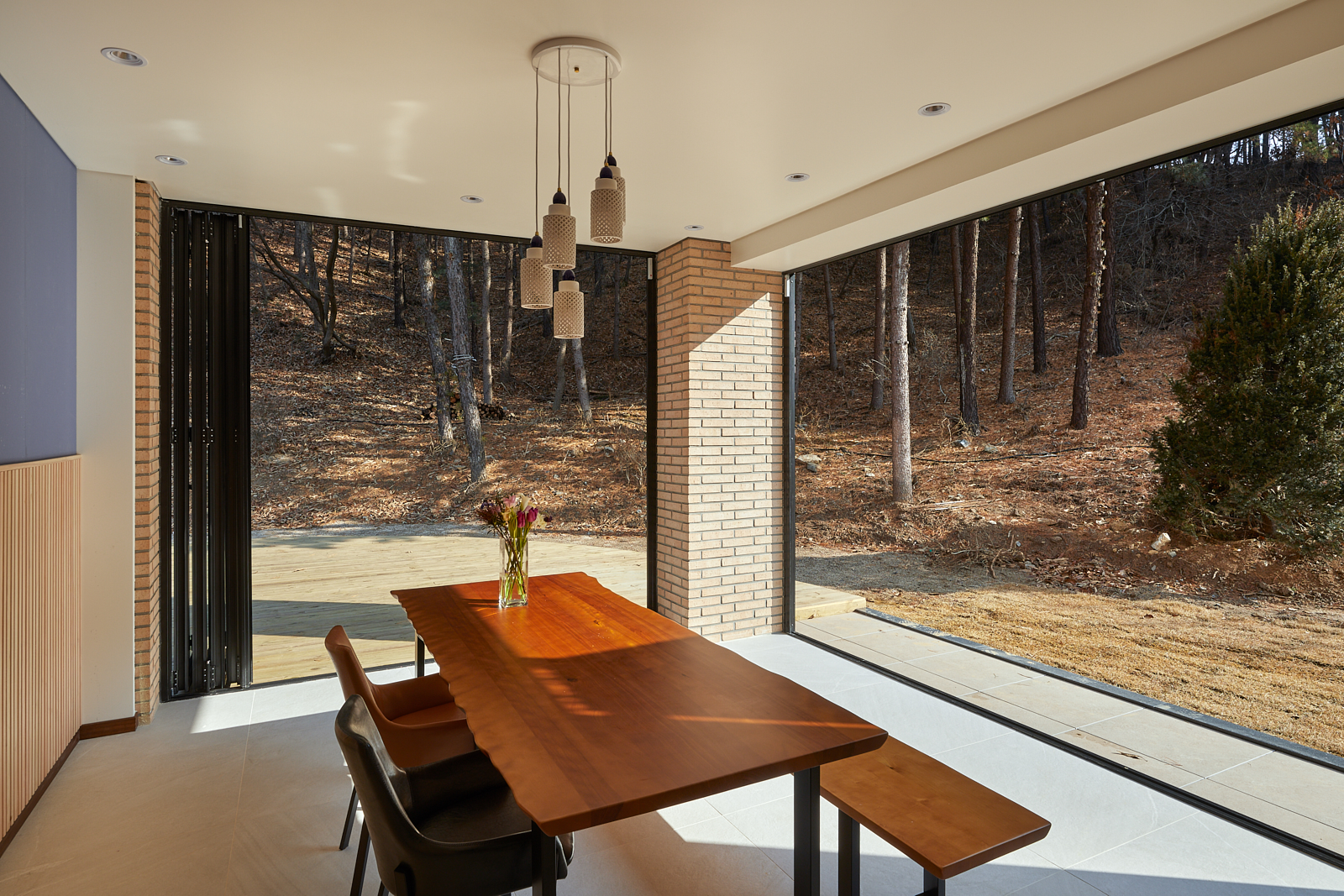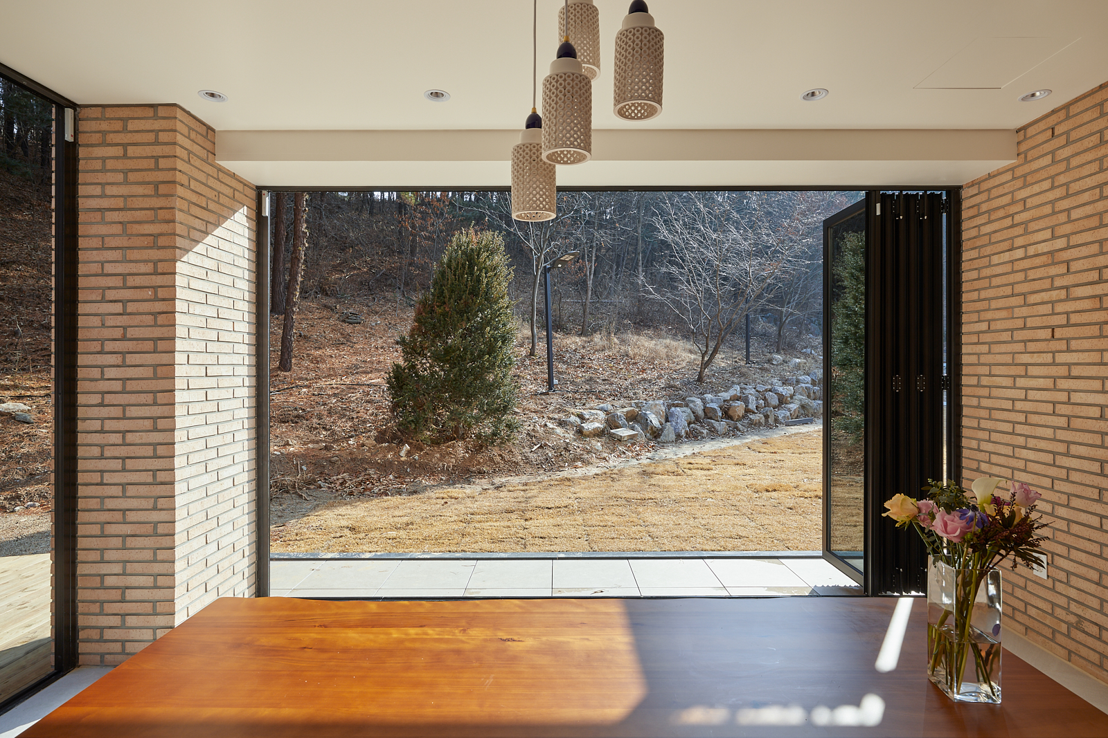 집은 진입도로를 등지고 나만의 내밀한 정원을 감싸 안는 형태가 되어 창을 절제한 북측면에 비해 편백나무 욕조가 있는 안방 욕실에도 부담 없이 큰 창을 두고, 식당은 두 면에 폴딩도어로 열 수 있게 하여 개방감을 극대화했다. 1층의 긴 처마는 집의 수평성을 강조하고 일조량을 조절할 뿐 아니라, 처마 아래 바닥의 포장을 따라 여유로운 외부 공간을 만든다. 2층 테라스의 기둥 없이 2.4미터가량 뻗은 처마는 개인적으로 가장 좋아하는 공간이다. 이 처마 아래에서의 날들이 가족들에게 아름다운 기억으로 새겨지길 바란다. 비가 오는 날, 유난히 햇살이 깊게 드리우는 날, 사방이 옅은 녹음으로 물드는 날, 각각의 날들이 시간이 흐르며 저마다의 색으로 중첩되어 갈 수 있도록 근사한 배경이 되어주는 일. 그게 건축이 해야 할 일 아닐까.