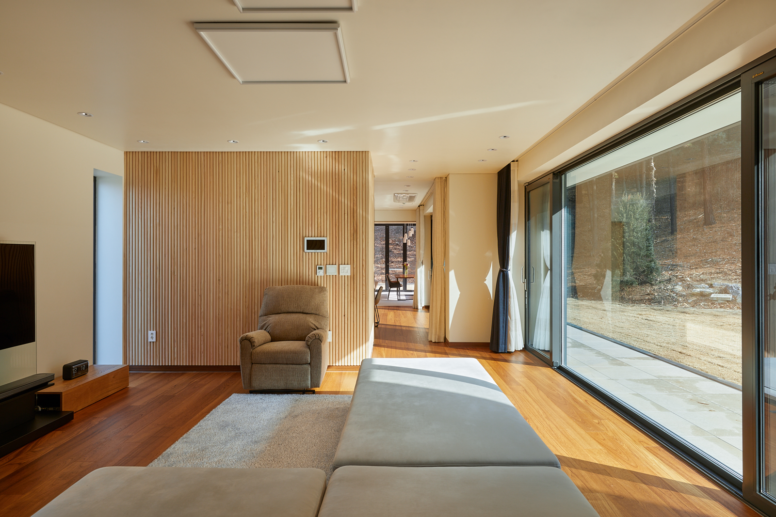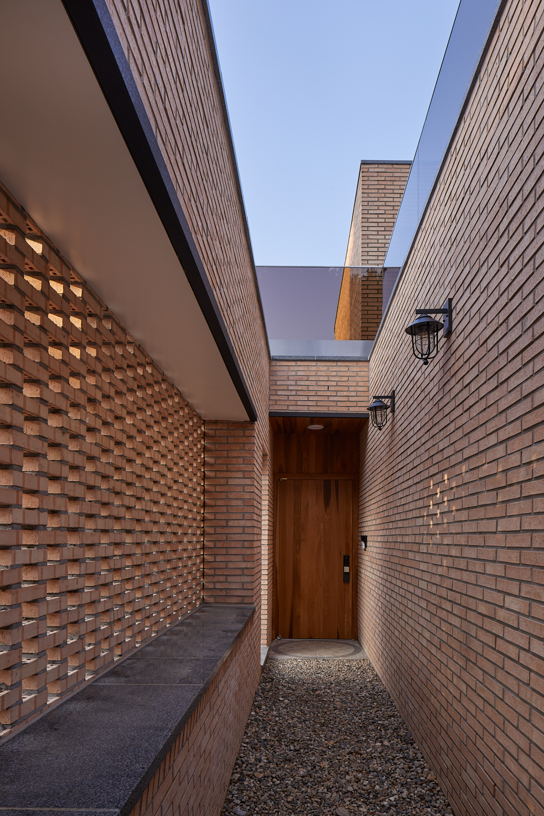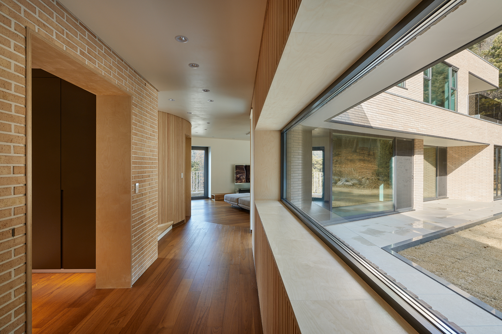 집은 진입도로를 등지고 나만의 내밀한 정원을 감싸 안는 형태가 되어 창을 절제한 북측면에 비해 편백나무 욕조가 있는 안방 욕실에도 부담 없이 큰 창을 두고, 식당은 두 면에 폴딩도어로 열 수 있게 하여 개방감을 극대화했다. 1층의 긴 처마는 집의 수평성을 강조하고 일조량을 조절할 뿐 아니라, 처마 아래 바닥의 포장을 따라 여유로운 외부 공간을 만든다. 2층 테라스의 기둥 없이 2.4미터가량 뻗은 처마는 개인적으로 가장 좋아하는 공간이다. 이 처마 아래에서의 날들이 가족들에게 아름다운 기억으로 새겨지길 바란다. 비가 오는 날, 유난히 햇살이 깊게 드리우는 날, 사방이 옅은 녹음으로 물드는 날, 각각의 날들이 시간이 흐르며 저마다의 색으로 중첩되어 갈 수 있도록 근사한 배경이 되어주는 일. 그게 건축이 해야 할 일 아닐까.