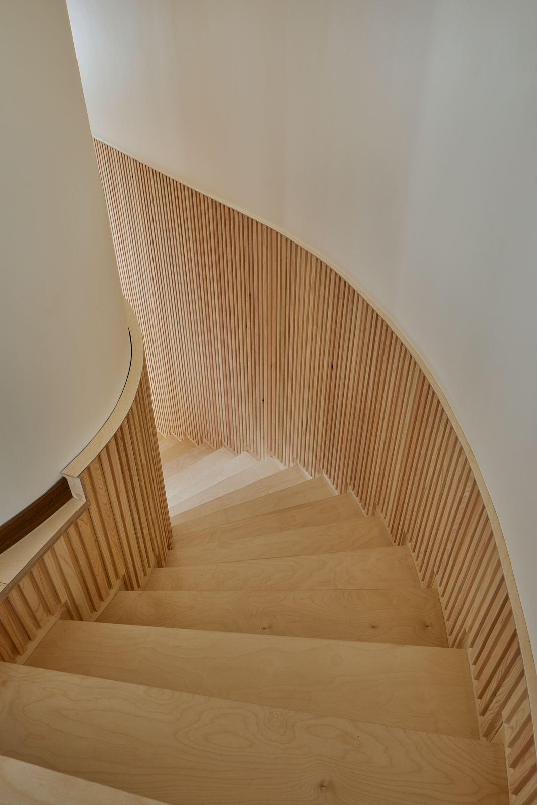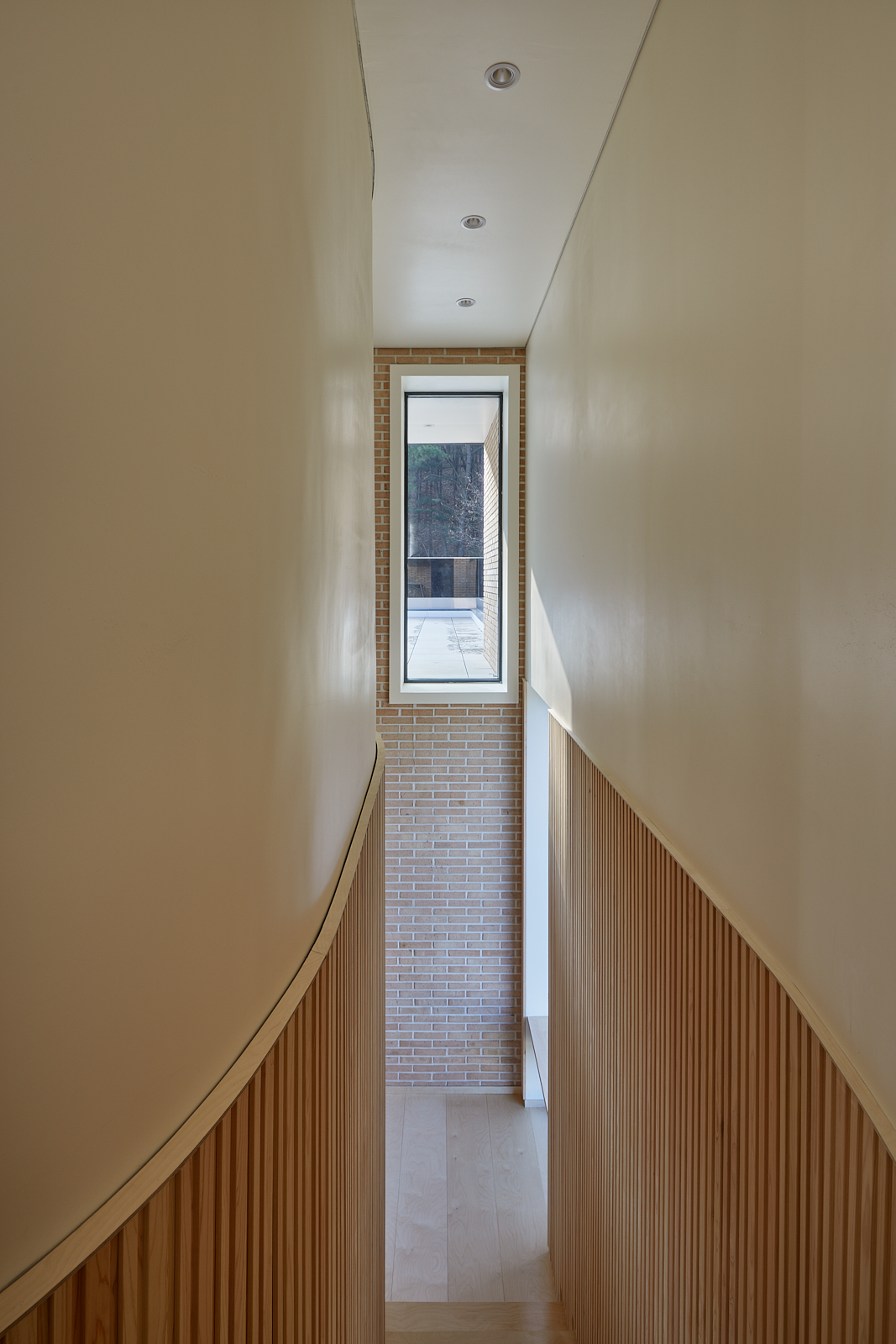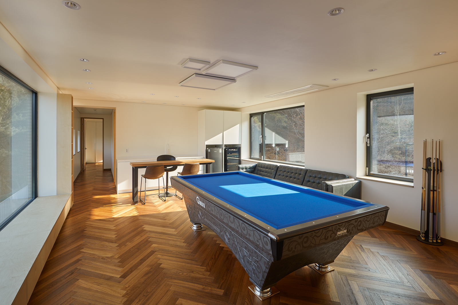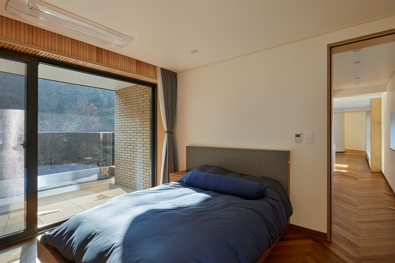 집은 진입도로를 등지고 나만의 내밀한 정원을 감싸 안는 형태가 되어 창을 절제한 북측면에 비해 편백나무 욕조가 있는 안방 욕실에도 부담 없이 큰 창을 두고, 식당은 두 면에 폴딩도어로 열 수 있게 하여 개방감을 극대화했다. 1층의 긴 처마는 집의 수평성을 강조하고 일조량을 조절할 뿐 아니라, 처마 아래 바닥의 포장을 따라 여유로운 외부 공간을 만든다. 2층 테라스의 기둥 없이 2.4미터가량 뻗은 처마는 개인적으로 가장 좋아하는 공간이다. 이 처마 아래에서의 날들이 가족들에게 아름다운 기억으로 새겨지길 바란다. 비가 오는 날, 유난히 햇살이 깊게 드리우는 날, 사방이 옅은 녹음으로 물드는 날, 각각의 날들이 시간이 흐르며 저마다의 색으로 중첩되어 갈 수 있도록 근사한 배경이 되어주는 일. 그게 건축이 해야 할 일 아닐까.