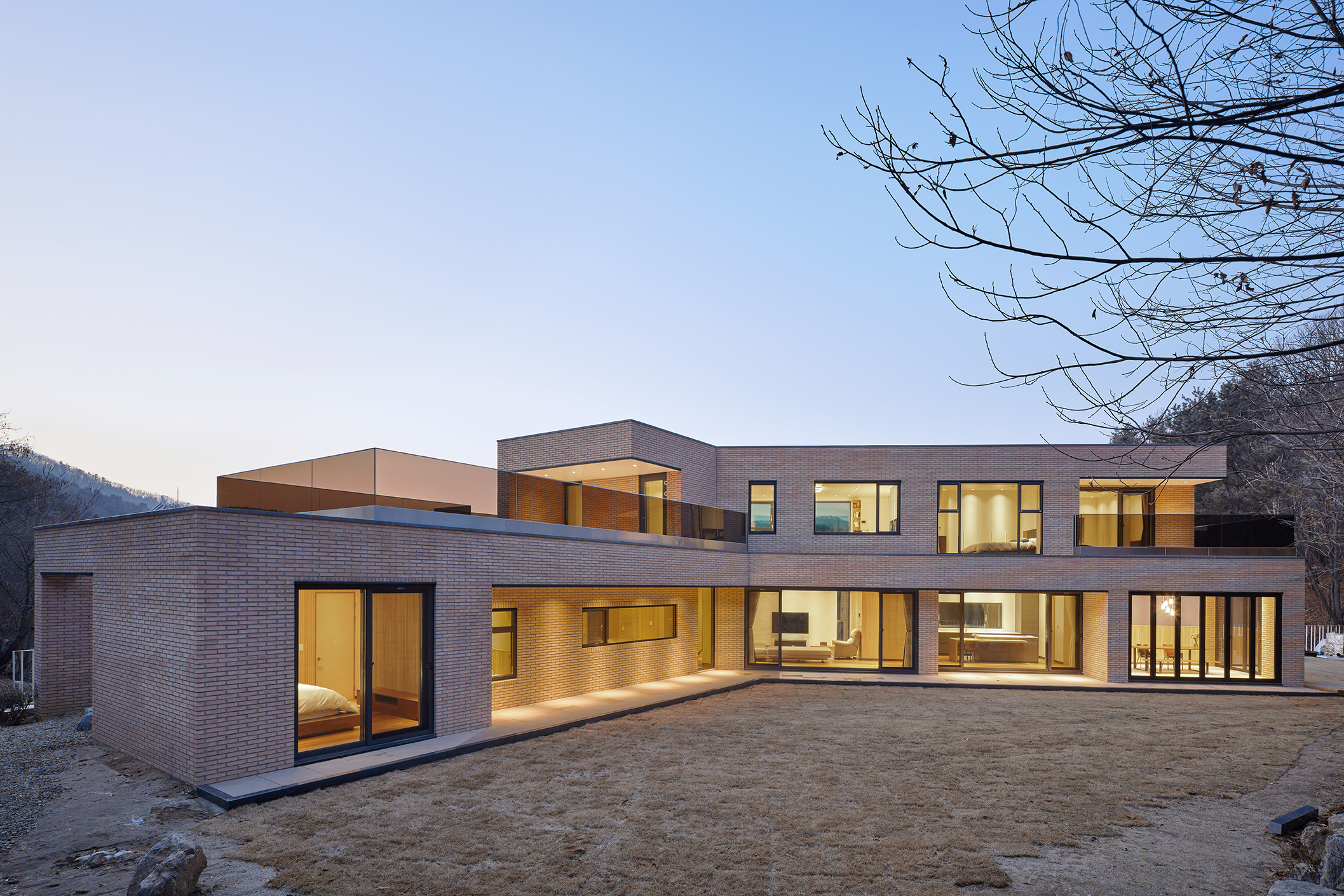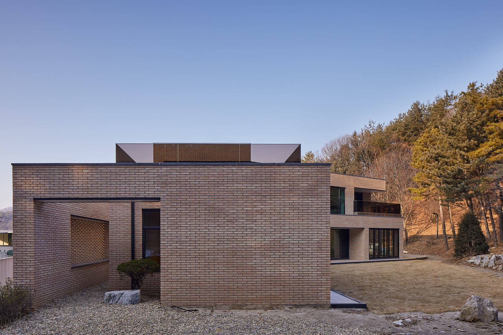 도로에서 대지가 이미 4.5미터 가량 높기 때문에 거기에 2층 높이를 올리는 것이 부담스러웠다. 건축주가 요구한 2층의 프로그램을 1층으로 넓게 깔아서 그렸다. 산세에 가능한 순응하는 낮고 넓게 펼쳐진 집. 벌려진 손가락 같은 집의 마디마디로 자연이 스며드는 집. 안됩니다, 지금은 없지만 언제라도 저 북쪽 대지에 다른 집이 들어서면 북쪽 풍광이 가려질 수 있어요, 2층이 되어야 이 경치를 방해 받지 않고 바라볼 수 있어요. 낮고 넓게 펼쳐진 1층 집 폐기.
