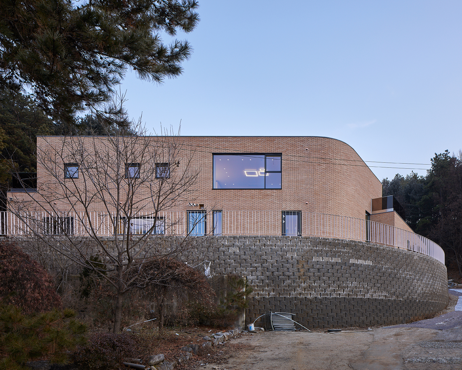 건축가로서 가질 법한 첫 번째 고민은 응당 저 4.5미터 가량의 보강토 옹벽을 어떻게 처리할 것인가였다.대지에 새겨진 인공의 흔적. 나 역시 지금부터 인공의 흔적을 남길 태세지만 솔직히는 보강토 블록 위에 앉은 전원주택의 상투성을 피하고 싶었다. 게다가 보강토 블록의 곡선은 비교적 넓은 대지에 비해서도 큰 반경으로 돌아가며 대지 전체를 정의하는 하나의 곡선을 그리고 있었다.